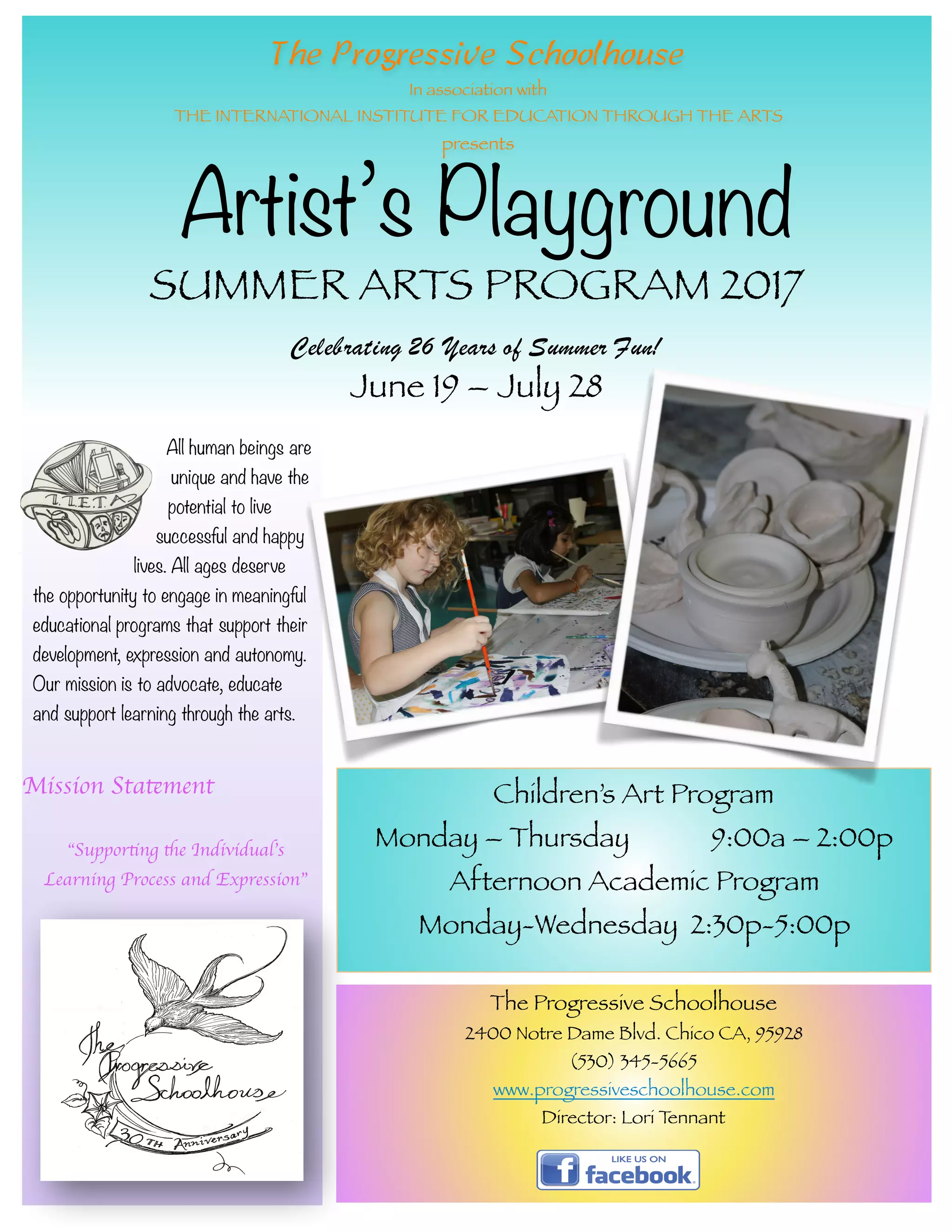 The Progressive Schoolhouse presents its Summer Arts Program from June 19th to July 28th celebrating 26 years. The program includes a Children's Art Program from 9am to 2pm Monday through Thursday with a focus on different art mediums each week like ceramics, drawing, textiles, theater, printmaking, and painting. An Afternoon Academic Program is also offered from 2:30pm to 5pm on Monday through Wednesday providing individualized tutoring in subjects like math, reading, science, and more. The document provides details on pricing, payment methods, and program information.