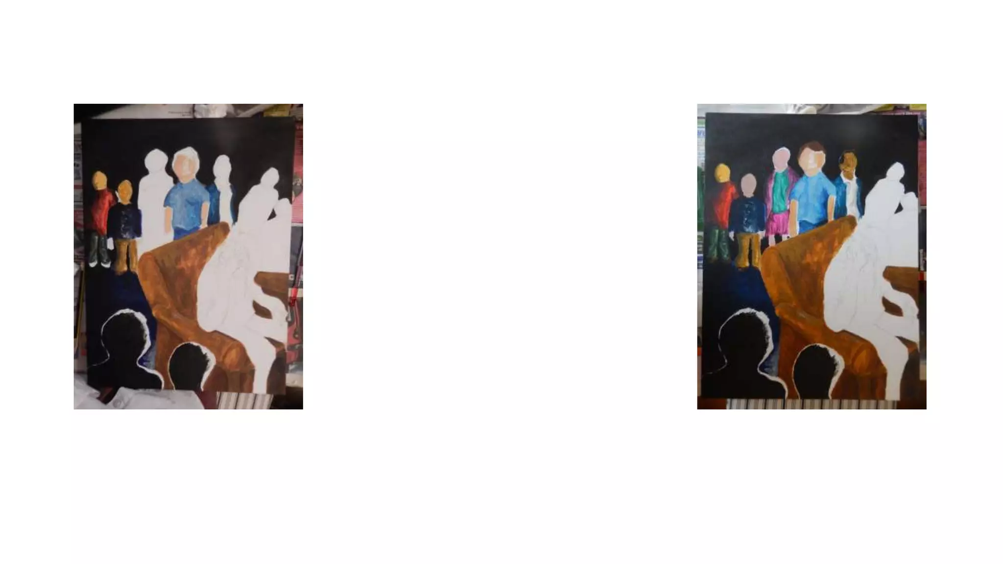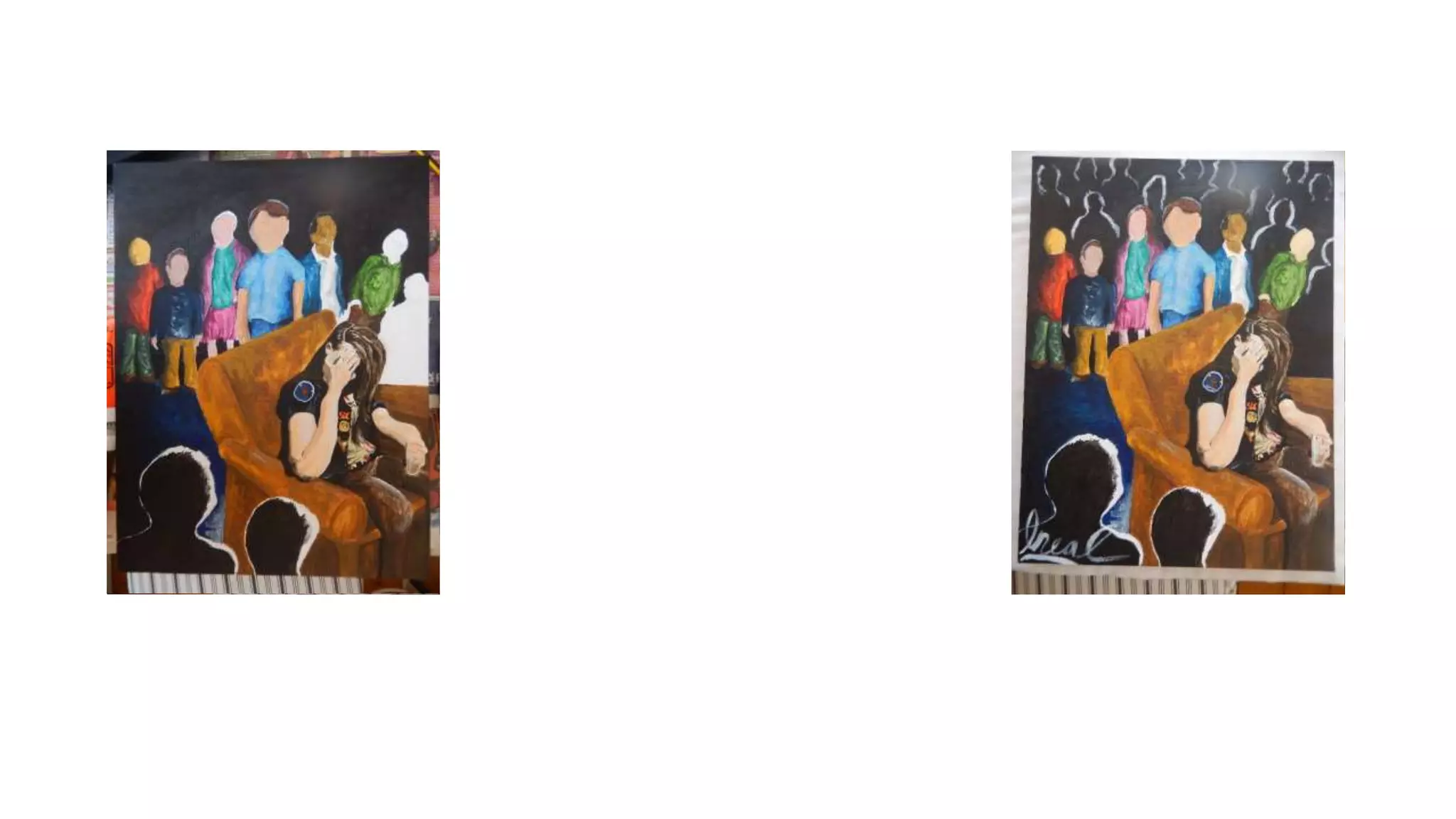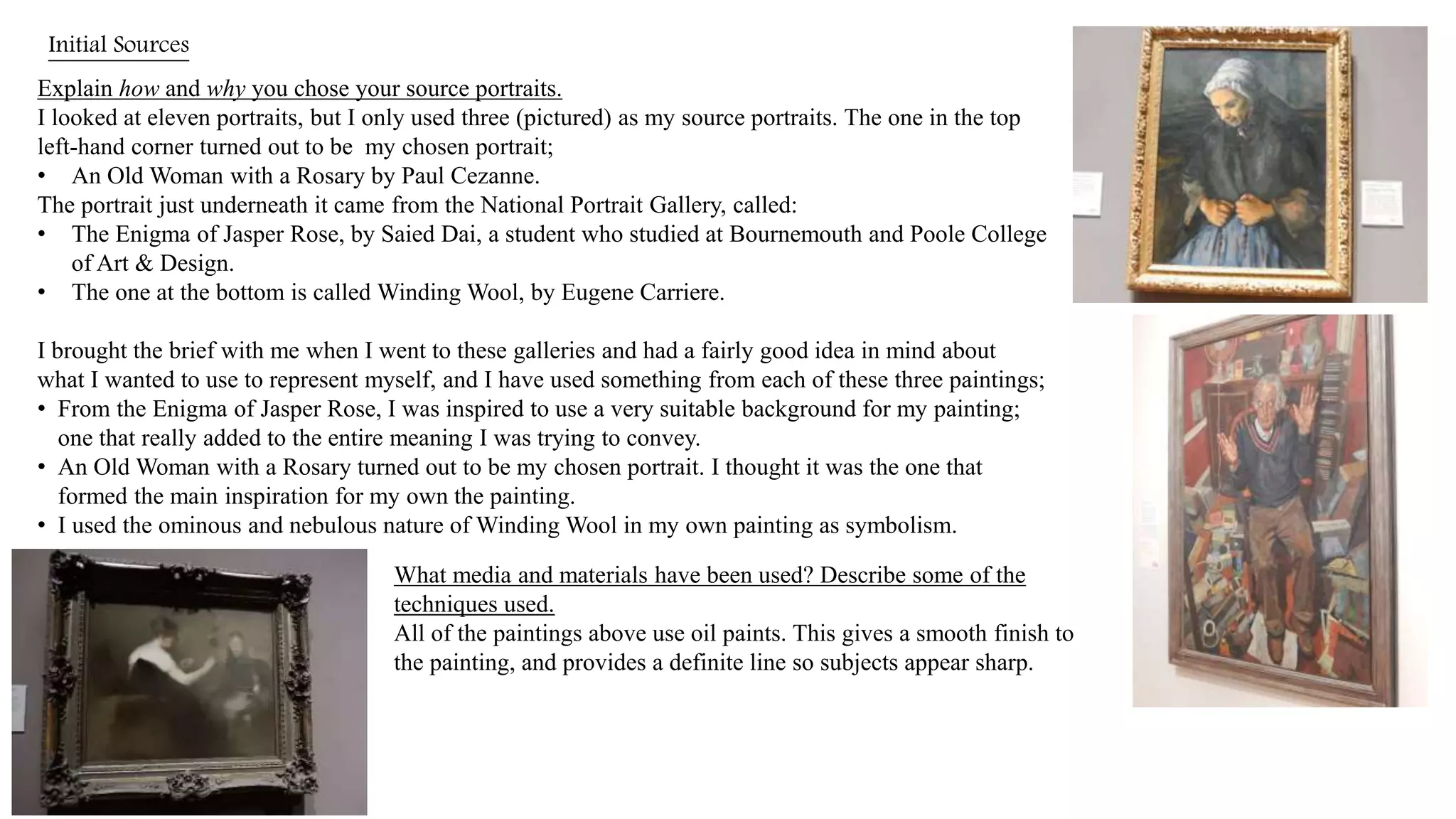 The document details a student's art and design summer assignment, focusing on their analysis of three source portraits and their personal painting inspired by these works. Key themes include identity, misunderstanding, and the representation of fear through artistic techniques and materials, primarily using acrylics. The student reflects on their learning journey, challenges faced, and future goals in art, emphasizing the importance of research and cultural exploration in their creative process.