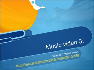 The document provides an analysis of the music video for "Lean On" by Major Lazer. It finds some relationships between the lyrics and visuals but also instances where they do not match. It notes that the video cuts to the beat of the music. The artist is portrayed sexually to appeal to younger audiences, and girls in the video are dressed provocatively and dance in a sexualized manner. While there are no references to other works, the video is similar to Major Lazer's other videos in its focus on dance and use of girls. The video is deemed more conceptual than narrative-based due to its random dancing without a story.