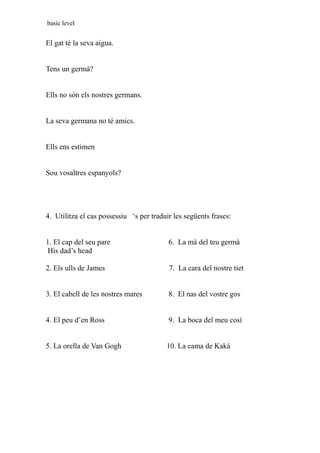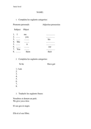 The document contains an exercise with fill-in-the-blank questions testing pronouns, verbs, and possessive adjectives in Spanish. There are also translation exercises, questions asking to write in the possessive case, write days, subjects, places, and more in Spanish. Comprehension questions are included about a story in a reading passage.