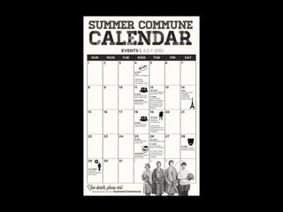 A group of people from different cities came together to create a temporary intentional community called DIY Commune in Moscow, Idaho. Without having met in person, they collaborated online and distributed information to attract others. When they arrived, locals and visitors attended open meetings to discuss living cooperatively for the summer. Residents participated in various social activities like parties, camping trips, and community events while reconnecting with rural skills. The DIY Commune was intended as a utopian social experiment in cooperative living.
