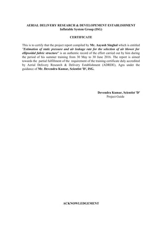 The summer vocational training report by Aayush Singhal details the estimation of air leakage rates and static pressure for selecting air blowers suitable for ellipsoidal fabric structures, conducted at the Aerial Delivery Research & Development Establishment (ADRDE), Agra. The report covers various aspects of air-supported structures, including their types, subsystems, materials, coating and sealing methods, and applications in different fields. The training experience was guided by Devendra Kumar and provided substantial knowledge regarding pneumatic structures and their functionalities.