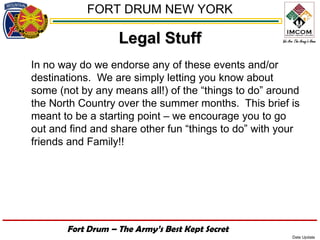 The document presents a comprehensive guide to activities and events in Fort Drum, New York, countering the myth that there's nothing to do in the area. It lists various summer attractions, including farmers markets, parades, fishing tournaments, live music, county fairs, craft fairs, and notable destinations. Additionally, it provides resources for further exploration and emphasizes the diverse recreational options available in the North Country.
