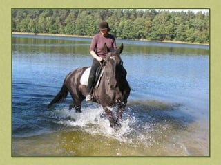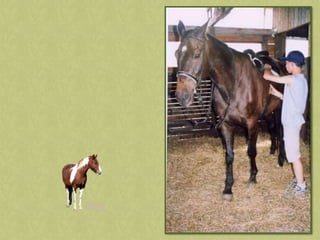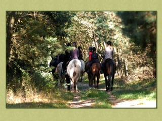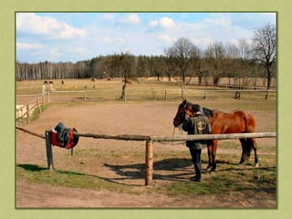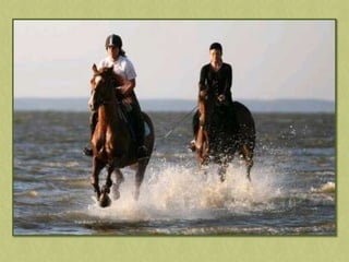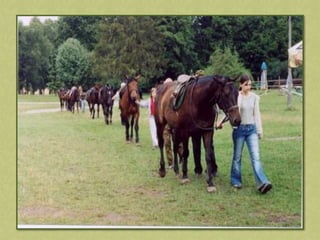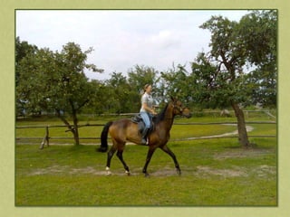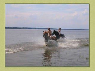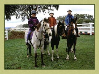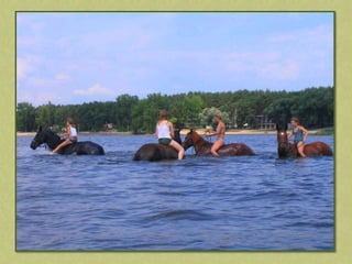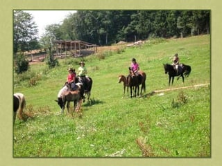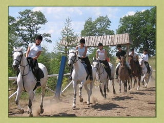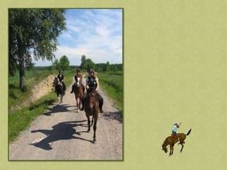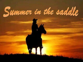 This document discusses summer activities related to horseback riding. It mentions a riding badge program and includes images of Dean Martin and Ricky Nelson in a movie scene with a rifle and pony, as well as an image chosen by Anna.