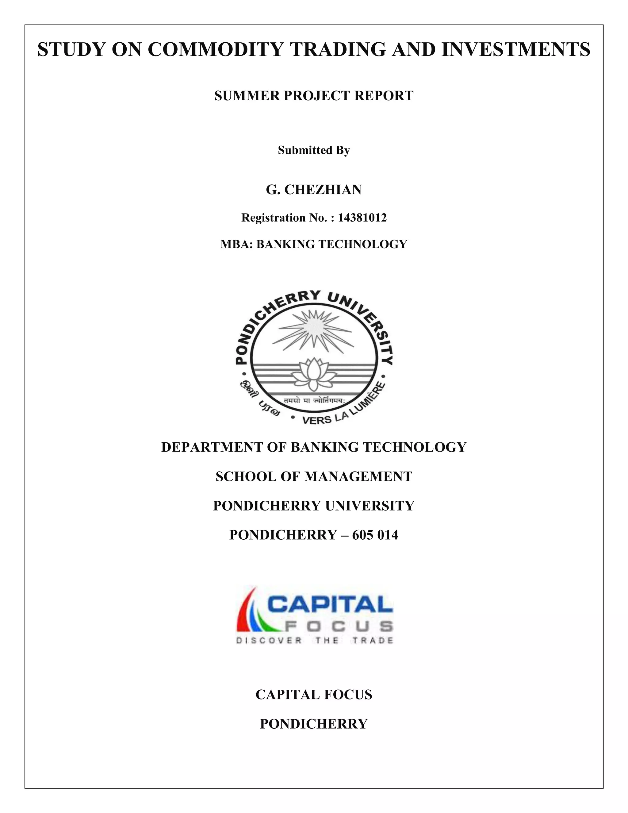 This document is a summer project report on commodity trading and investments submitted by G. Chezhian for an MBA degree at Pondicherry University. It outlines the fundamentals of investment and trading, highlights the importance of commodity markets, and discusses various aspects of speculative practices and historical context. The report includes a detailed analysis of investment methodologies and the evolution of commodity markets, including futures trading in India.