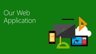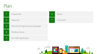 This document outlines a plan to develop a web application using tools like Dreamweaver, Photoshop, and Movie Maker. It will be built with HTML5, JavaScript, CSS, PHP5, and SQL, and deployed on the Windows Azure platform. The objective is to design a UI, write code, test the app package, and deploy it on Azure. Tools like Windows Azure and programming languages like HTML5 and JavaScript will be used to create the demo app and host it in the cloud.