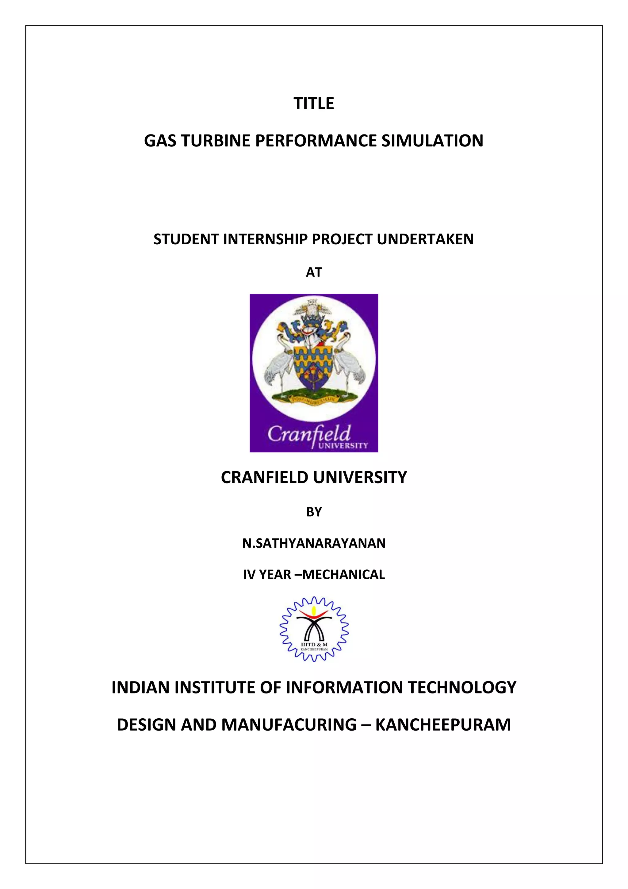 This document summarizes a student internship project on gas turbine performance simulation undertaken at Cranfield University. The project involved using Turbomatch software to simulate the off-design performance of 3 turbofan engines - CFM56-7B27, Rolls Royce Trent 1000, and Pratt & Whitney 4084. The student analyzed compressor maps, plotted performance parameters like thrust and SFC against turbine inlet temperature and ambient temperature, and compared results between 2 versions of Turbomatch software. The analysis provided insights into engine operation and limitations as well as improvements in the new Turbomatch version.