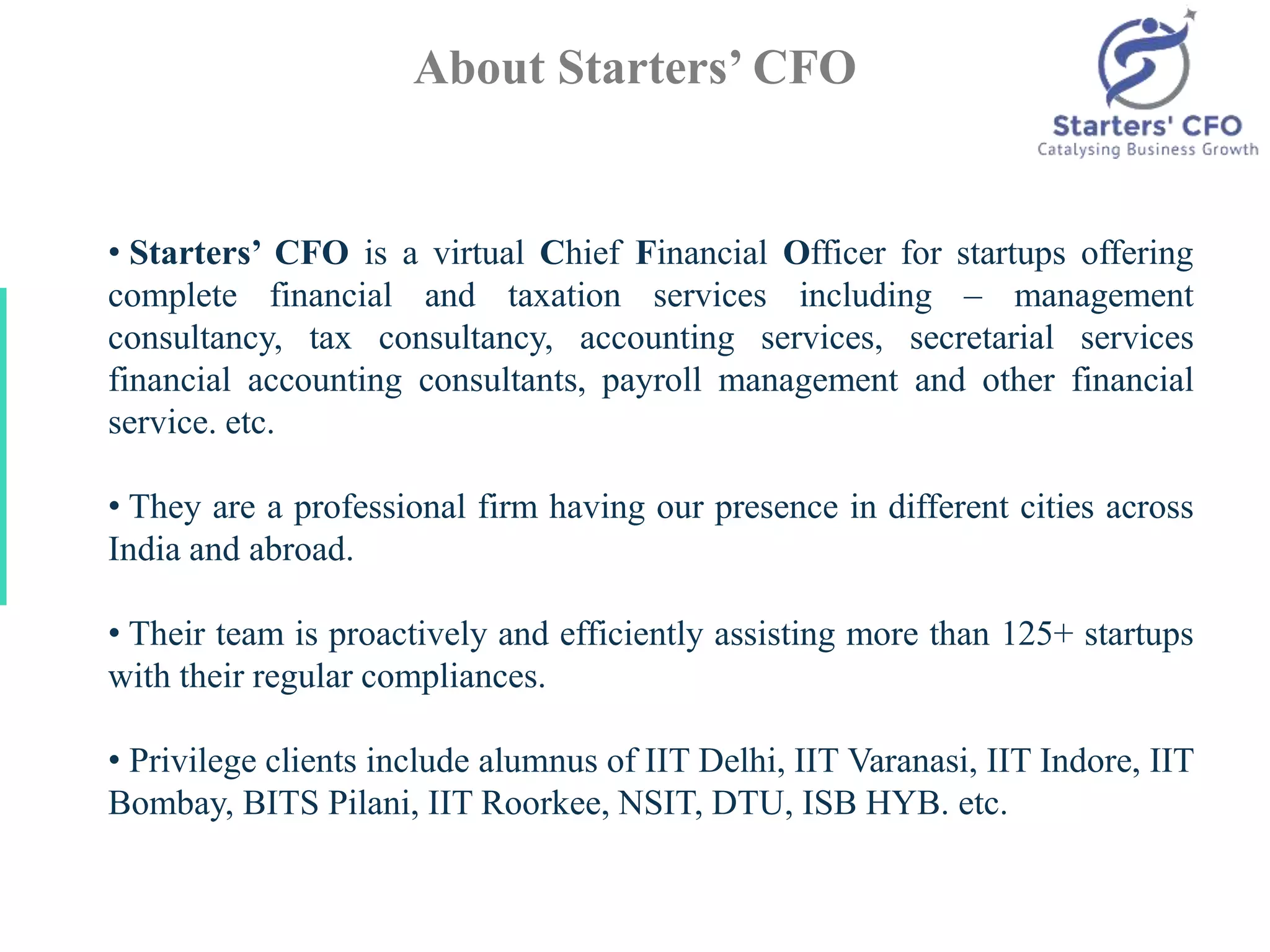 The document outlines the role of Starters’ CFO as a virtual chief financial officer for startups, providing a comprehensive array of financial services while assisting over 125 startups with compliance and operational needs. It also discusses the startup ecosystem in India, detailing the stages of startup development, key challenges faced, and the regulatory landscape, emphasizing the need for a stable environment amid evolving policies. Additionally, it includes recommendations for enhancing government support, funding, and marketing strategies tailored for startups.