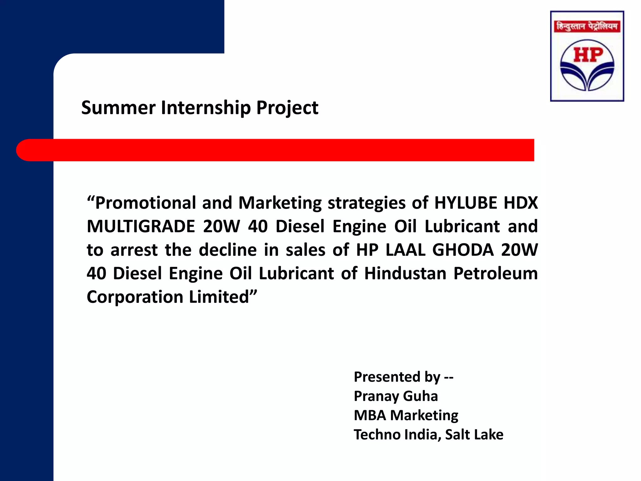 The document outlines a summer internship project focused on the promotional and marketing strategies for Hindustan Petroleum Corporation Limited's diesel engine oils, specifically addressing the decline in sales of the HP Laal Ghoda 20W 40 product. It includes detailed research objectives, methodology, data analysis using factor and regression analysis, and findings related to the market conditions and consumer preferences. The report concludes with policy prescriptions aimed at improving sales, including enhanced packaging, targeted promotions, and better distribution strategies.