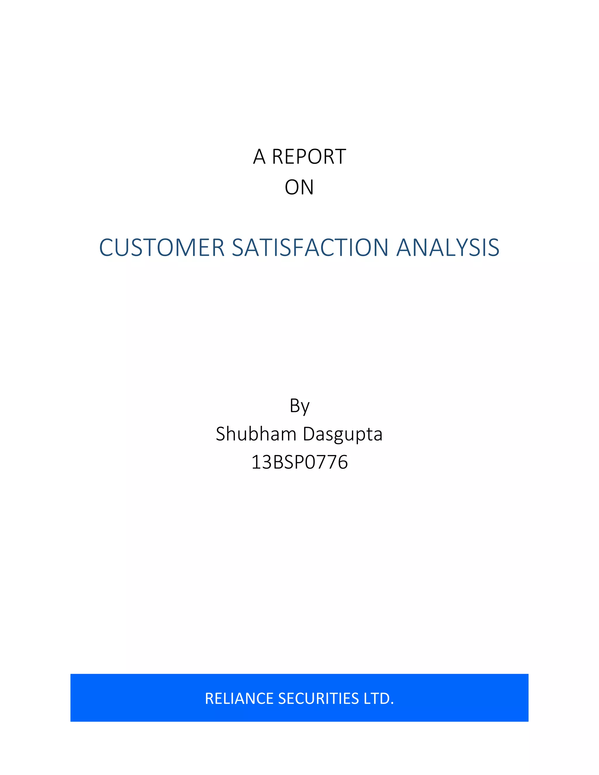 This document is a report on customer satisfaction analysis for Reliance Securities Ltd conducted by Shubham Dasgupta. It includes an authorization from the company guide and faculty guide. It also acknowledges those who contributed to the project. The report contains an executive summary, industry analysis using Porter's five forces model, company profile of Reliance Securities, research methodology adopted, data collection details, results and findings of the analysis, gap analysis, additional analysis, conclusions and recommendations. The major findings indicate that relationship managers are key but gaps exist in technology usage and process time which affect customer satisfaction. Recommendations focus on addressing these gaps.