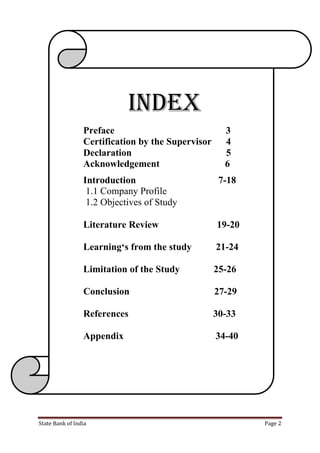 The document is an internship report submitted by Mayank Mulchandani to Medi-Caps University for their MBA program. It details their 8 week internship at State Bank of India in the Credit Division. It includes sections on the company profile of SBI, describing it as a major public sector bank in India. It provides information on SBI's history dating back to 1806, its current position and services offered which include personal, rural, SME and corporate banking. The report was prepared under the supervision of Mr. Prakash Kumar Shukla, Branch Head of SBI's MG Road branch.
