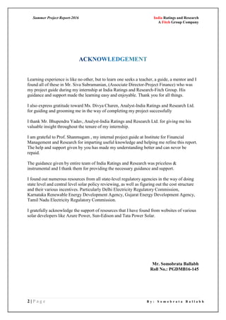 This document is a summer project report submitted by Somobrata Ballabh analyzing the viability of solar rooftop business models in India and assessing credit ratings for solar PV projects. The report discusses key drivers for the Indian solar sector such as innovative financing models, feed-in tariffs, viability gap funding, and policies. It analyzes the performance of the national solar mission and rooftop solar segment. The report also examines issues in the rooftop solar market like competition, policies, financing costs and provides recommendations. Finally, it outlines the methodology for evaluating and assigning credit ratings to solar thermal power projects.