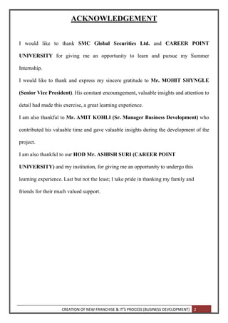 It begins with background on India's stock exchanges (BSE and NSE) and market structure, including trading hours, settlement cycles, and indexes. It then profiles SMC Global Securities and its offerings. The document outlines the requirements and process for becoming an AP, including infrastructure, prospect identification, registration, and NISM certification. It concludes with learning from the author's internship experience in business development.