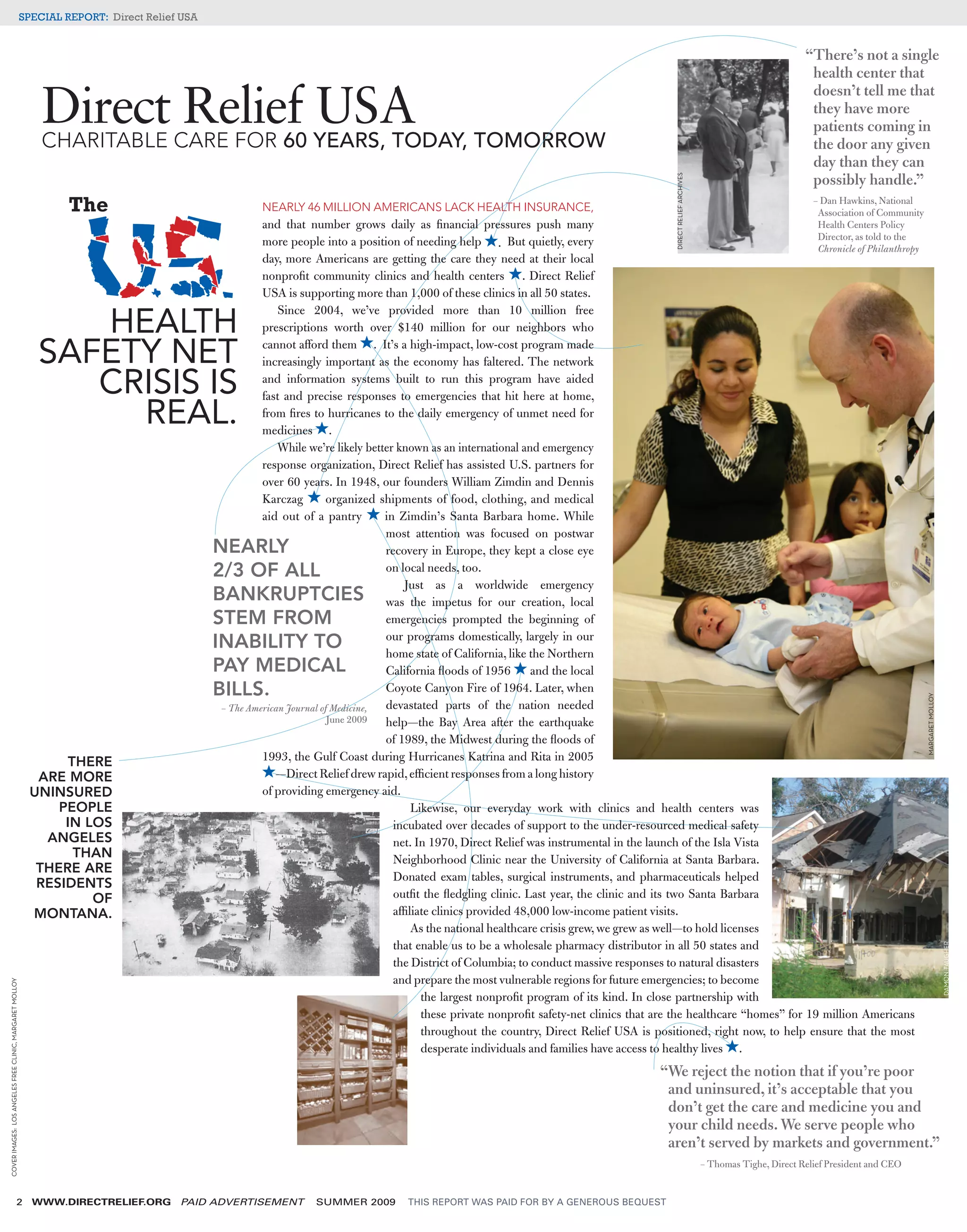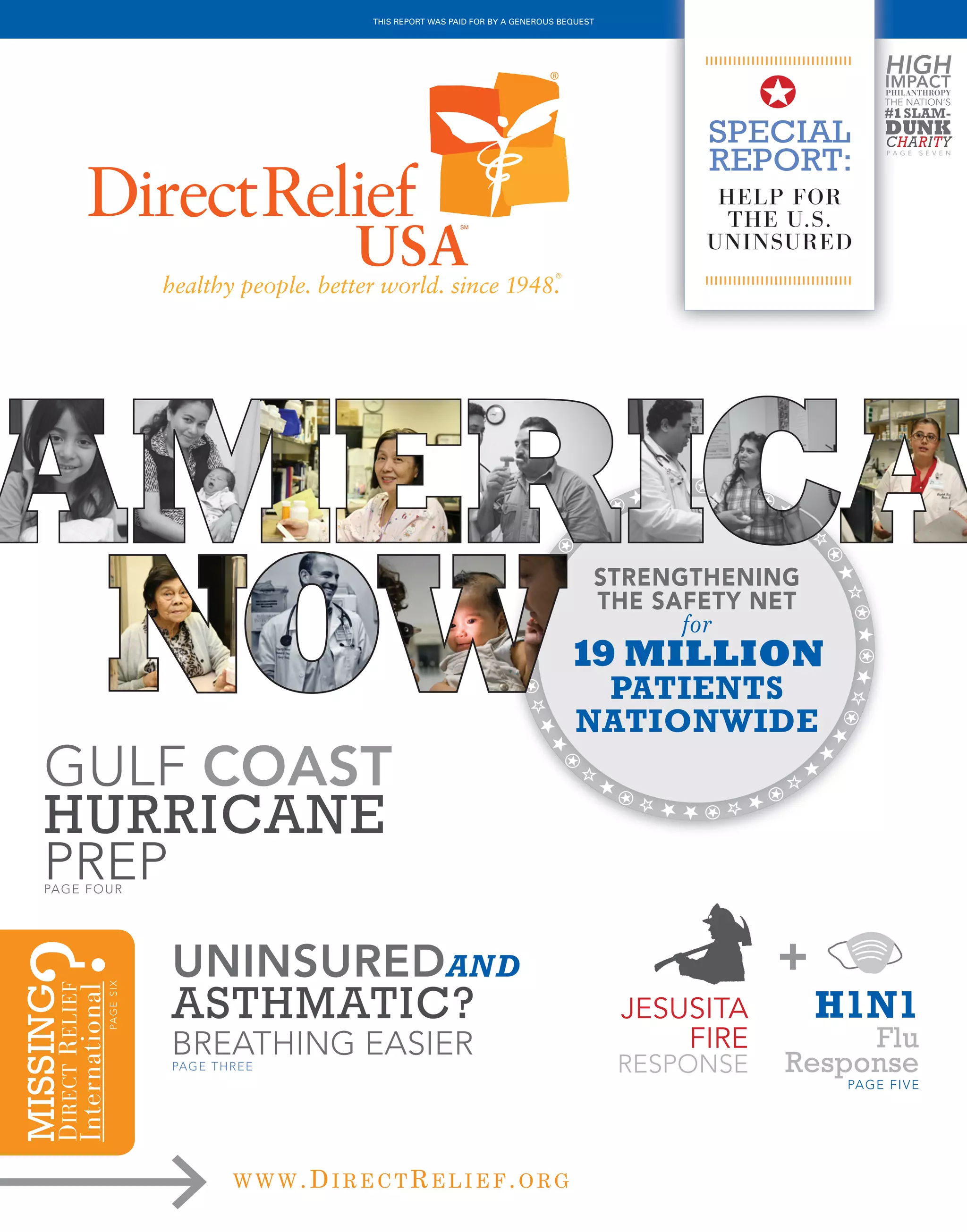 This document summarizes Direct Relief USA's efforts to provide healthcare assistance to those in need. It discusses how Direct Relief has supported over 1,000 community health clinics across the US for over 60 years by providing over $140 million worth of free prescriptions. It also details specific programs like distributing 500,000 asthma inhalers nationwide through clinics and preparing Gulf Coast clinics for the hurricane season with medical supply packs.