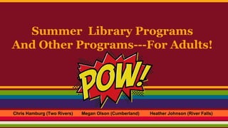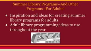 The document provides information about summer library programs for adults from several libraries. It discusses adult summer programs at the River Falls Public Library in Wisconsin, including their book club in a bar program and use of prizes and publicity. It also describes the Thomas St. Angelo Public Library's transition from an elaborate adult summer bingo program to smaller, mini reading challenges. Finally, it outlines the Lester Public Library's adult summer reading review card program, incentives, prizes, marketing strategies, and ideas for additional adult programming throughout the year on topics like local history and sustainable living skills.