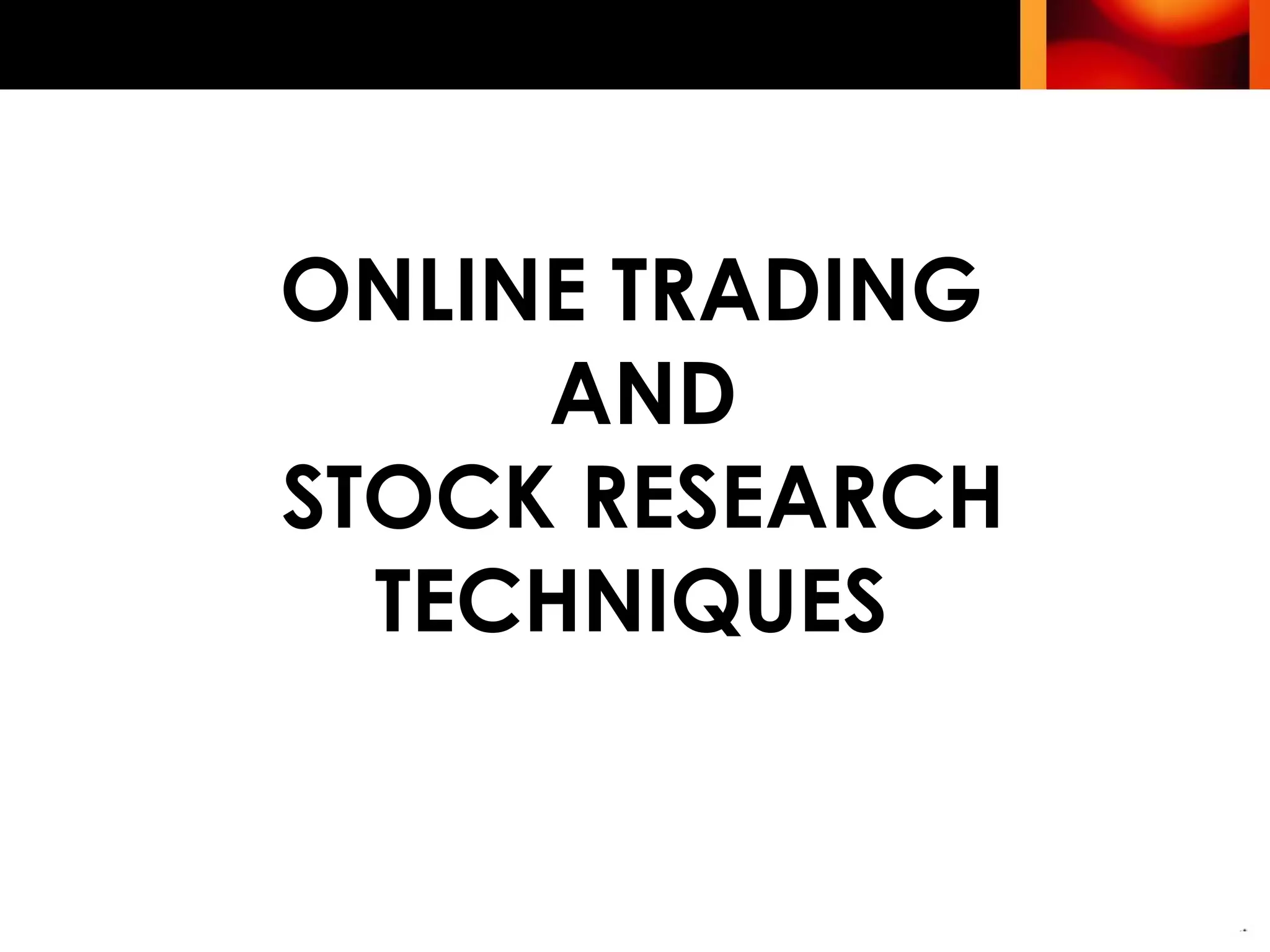 The document discusses various techniques for analyzing stocks and selecting companies to invest in, including fundamental analysis and technical analysis. It describes Dow Theory, Elliott Wave Theory, and candlestick patterns as technical analysis methods. It also covers the types of stock market participants, online trading mechanisms, and order placing on stock exchanges.
