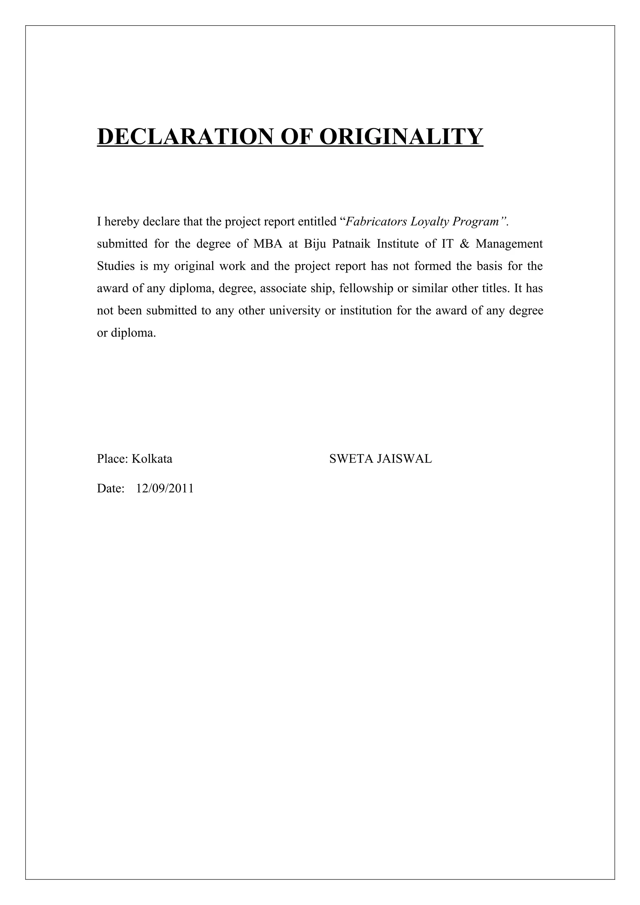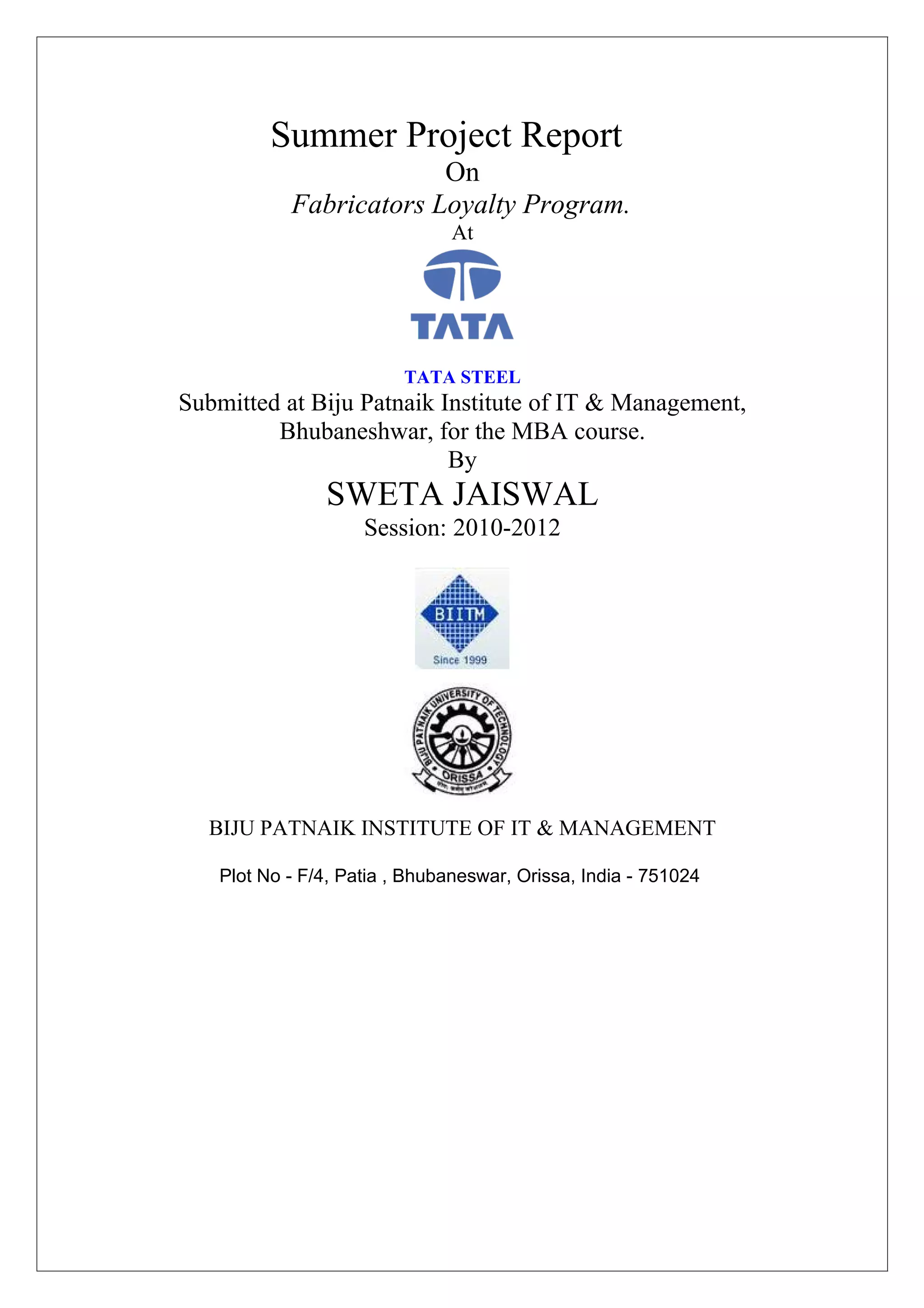 The document is a summer project report submitted by Sweta Jaiswal for her MBA course at the Biju Patnaik Institute of IT & Management. The report focuses on analyzing the fabricators loyalty program of Tata Steel in India. It includes sections on the history and profile of Tata Steel, an overview of the objectives and methodology of the analysis of the fabricators loyalty program, as well as preliminary findings and recommendations.