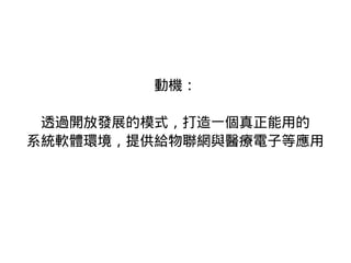 此文档介绍了 f9 microkernel 的开发动机与背景,侧重于为物联网和医疗电子应用提供开放系统软件环境。文档还涵盖了该项目的技术特点、参与者的好处以及与社区合作的开放源码策略。最后,列出了开发所需的设备规格和参与方向。