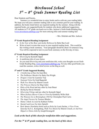 This document provides a summer reading list for students in 3rd through 8th grade at Birchwood School. It includes required reading books for each grade as well as suggested series and topics. Students are encouraged to cultivate their reading habits over the summer and discuss their required books during the first week of school. The list also provides nonfiction topics and series for additional reading. Students are asked to keep track of events from their books or character descriptions to help remember what they read.