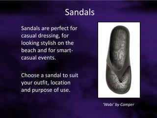 The document provides guidance for choosing summer sandals for men, emphasizing that they should be stylish yet suitable for the occasion, such as beach or smart-casual events. It outlines dos and don’ts, recommends specific brands like Birkenstock and Kurt Geiger, and suggests choosing neutral colors while advising against wearing socks or designer sandals in inappropriate settings. Overall, it stresses the importance of caring for sandals like shoes and matching them to the outfit and location.