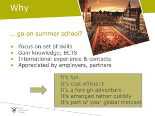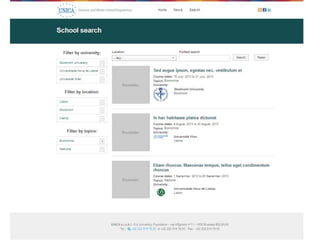This document discusses the benefits of summer schools for students and universities and presents a plan for a strategic online platform called Unica to promote summer/winter school programs. Key points include: