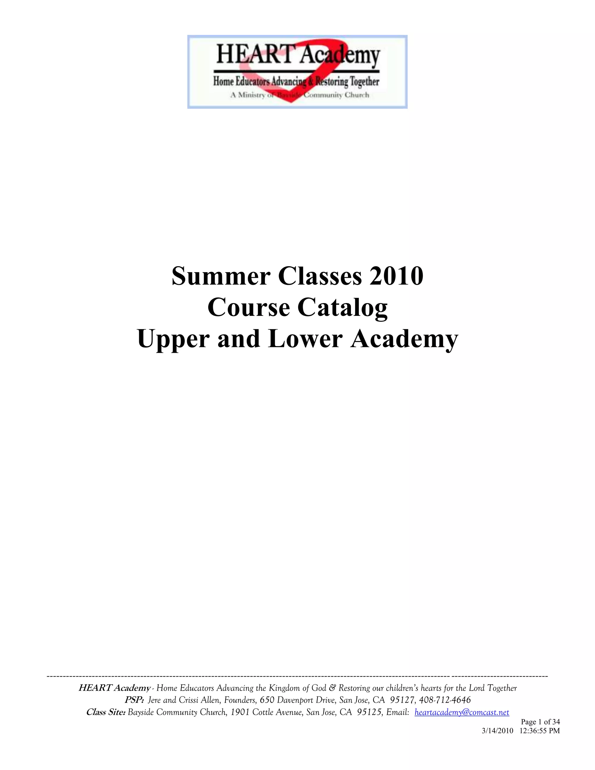The document is a course catalog for summer classes at HEART Academy. It lists over 20 classes offered on Wednesdays from 9:00-11:30 am and 12:00-2:30 pm, ranging from fitness, dance, art, language, and academic subjects. For each class, it provides the course title, mentor-teacher, dates, costs, descriptions, requirements, and contact information. The catalog shows that HEART Academy offers a variety of enrichment classes taught by experienced mentor-teachers in a Christian environment.