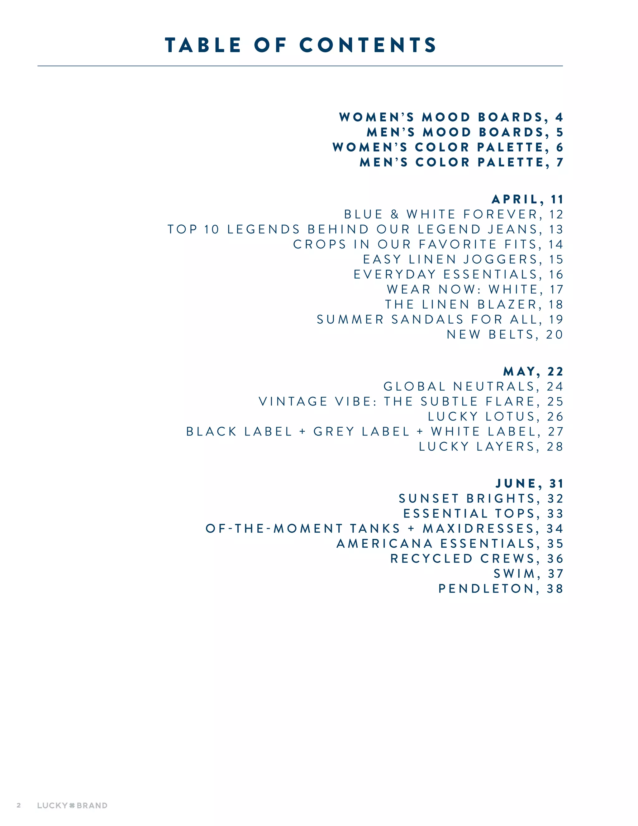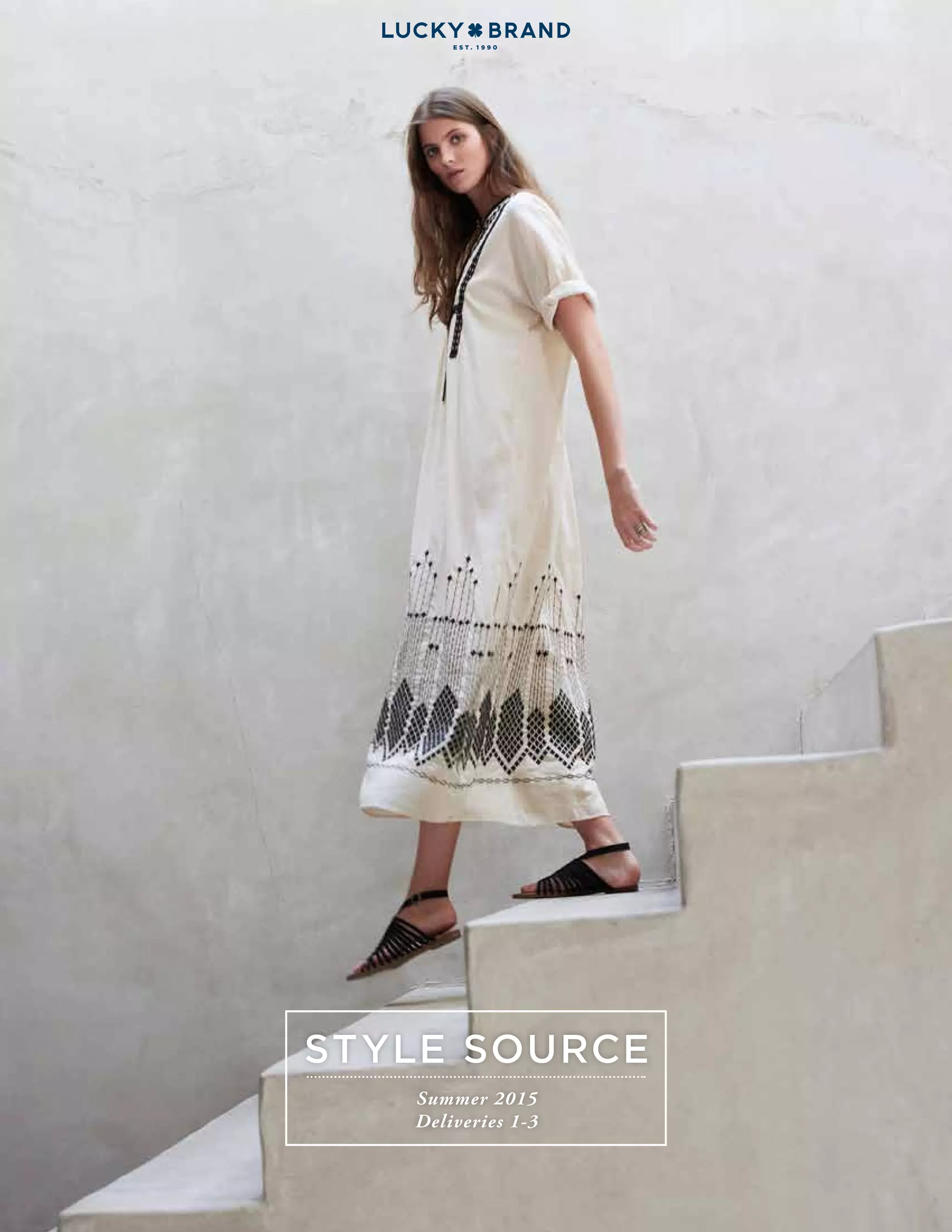 This document provides a style source for summer 2015 deliveries 1-3. It includes mood boards, color palettes, and articles with themes for each month (April, May, June). The April section highlights blue and white styles inspired by coastal locations, introduces new denim fits and washes, and features blazers and accessories. The May section focuses on global neutrals, vintage bootcut jeans, and a Lucky Lotus yoga-inspired capsule collection. The June section previews sunset-inspired colors and essential tops.