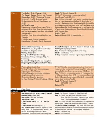 This document provides an overview of the class work and homework assignments for a 4-week course. It includes instructions for 4 essays on various topics, readings from course textbooks, vocabulary studies, online discussion posts, and in-class activities like speeches. Students are assigned chapters from The Hunger Games to read each week and must complete outlines, drafts, and revisions of their essays. Class sessions include lectures, discussions, peer reviews, and essay writing. The goal is to introduce different essay types and refine writing skills through multiple drafts.