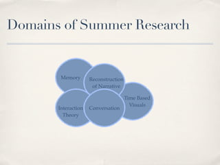 Laura Simpson conducted summer thesis research exploring memory reconstruction through narrative and time-based visuals. Her research domains included memory, narrative, interaction theory, and conversation. She developed a first-person narrative memory game called Lethe that uses visuospatial minigames like Tetris and puzzles to help trauma victims reconstruct memories, taking inspiration from a study showing Tetris can act as a "PTSD vaccine." The game tells the narrative through cutscenes in reverse order and has the player work backward through therapeutic minigames to fill in missing events.