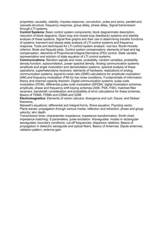 The document outlines the comprehensive curriculum for Electronics and Communication Engineering, covering essential topics in mathematics, electronics, communication systems, digital circuits, control systems, and electromagnetics. Key areas include differential equations, circuit analysis, signal processing, and communication techniques. The structure encompasses both theoretical concepts and practical applications across various engineering disciplines.
