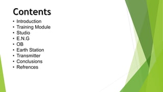 Doordarshan is India's public service broadcaster and one of the largest broadcasting organizations in India in terms of studio and transmitter infrastructure. It began experimental broadcasts in 1959 and became a daily broadcaster in 1965. Doordarshan now broadcasts through nearly 1,400 terrestrial transmitters, reaching over 90% of India's population. It has 46 studios producing television programs and manages production, storage, transmission, and maintenance of channels through departments like studio, ENG section, NLE, OB, earth station, and transmitter.