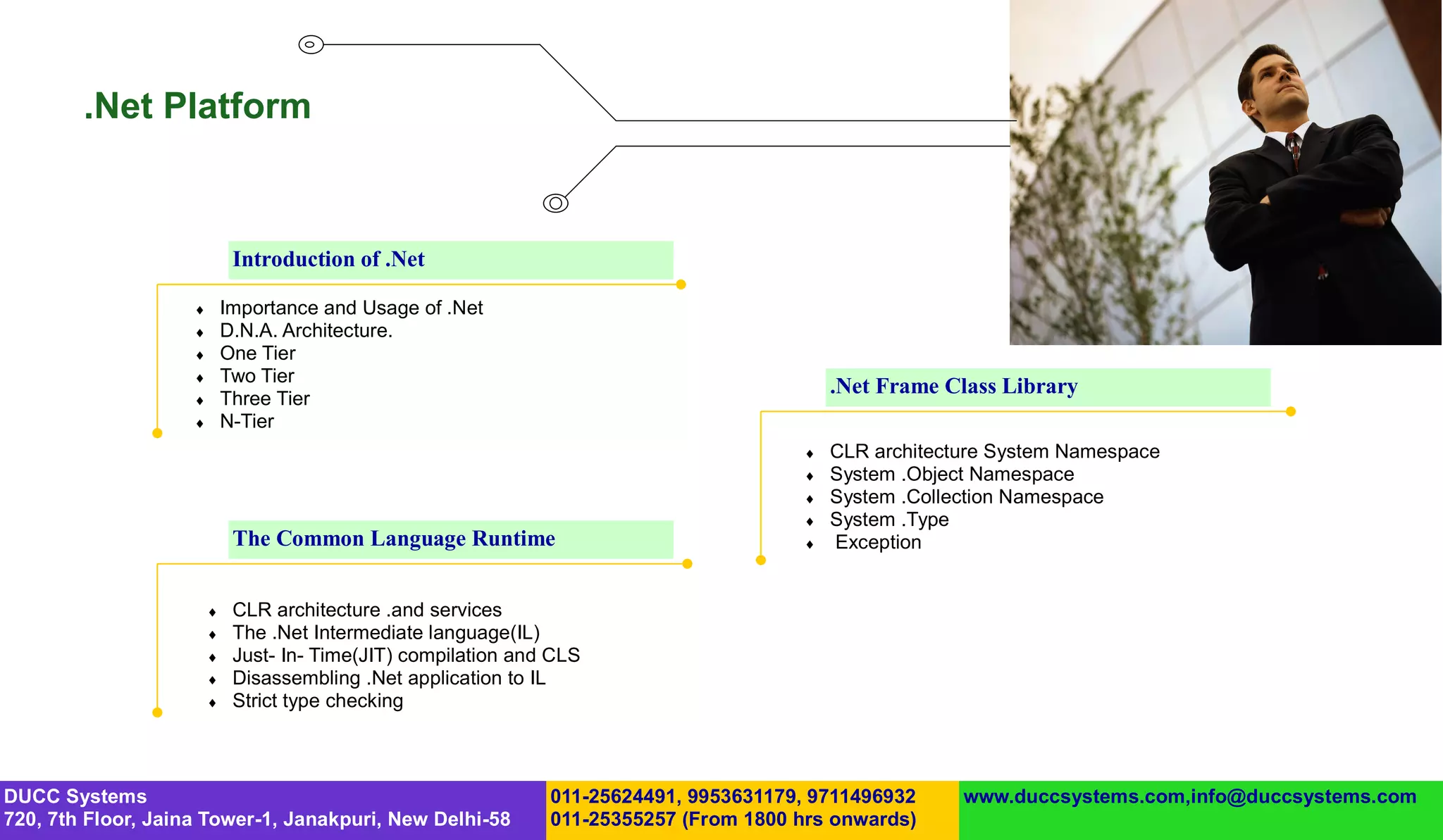 The document discusses the topics that will be covered in a .NET summer training program, including introductions to .NET framework classes, data types, OOP concepts, inheritance, multithreading, exception handling, file I/O, ADO.NET, web forms, and HTML controls. The training will cover syntax, architecture, and implementations related to these .NET and web development technologies.
