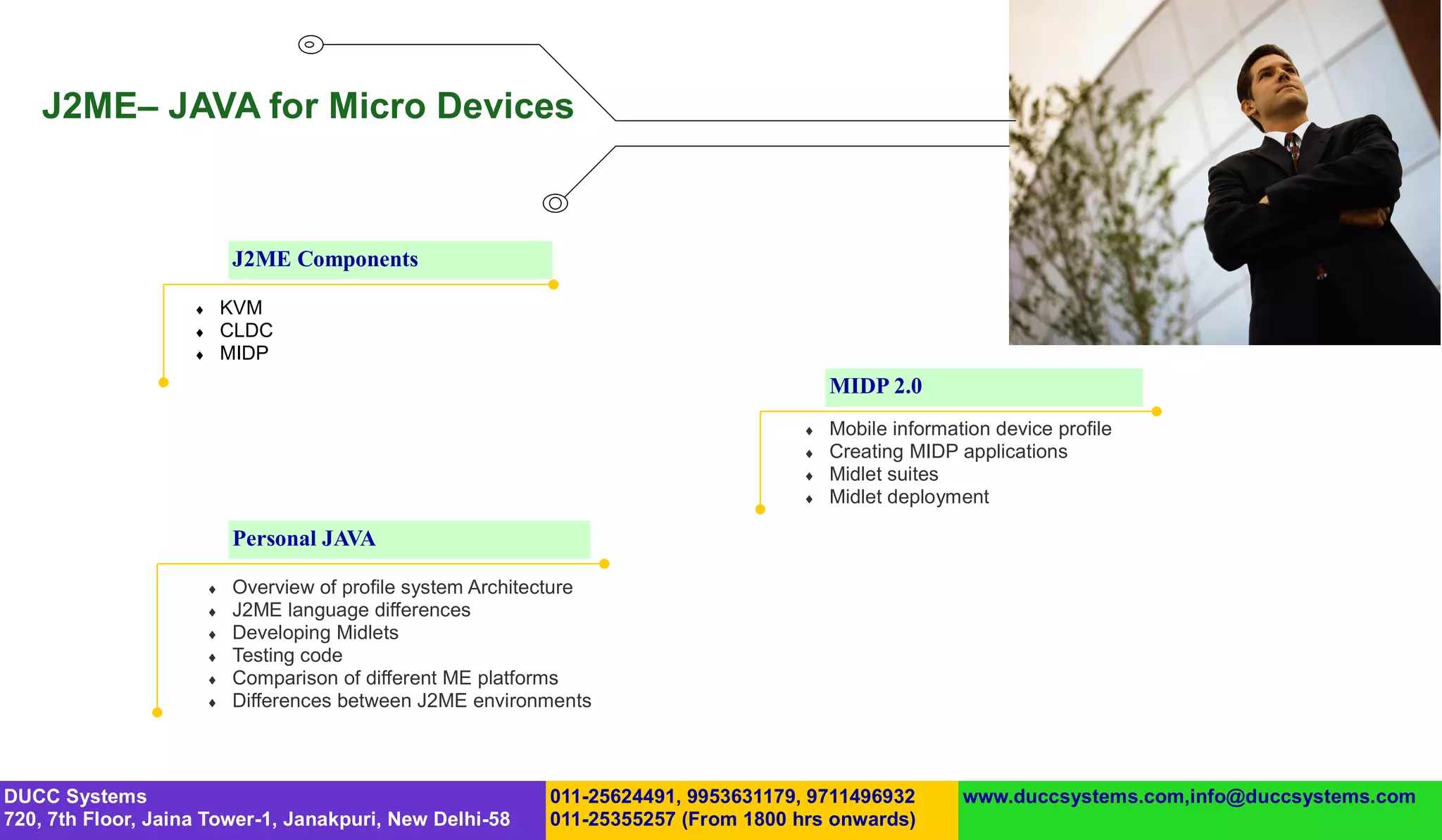 The document outlines the topics to be covered in a summer training program at DUCC Systems on J2ME - Java for Micro Devices. The training will cover J2ME components including KVM, CLDC and MIDP; developing MIDP applications; MIDP 2.0 GUIs; J2ME capabilities like I/O, networking and data persistence; threading and synchronization; connectivity options; APIs; and a live project. It details the steps for applying to the training program and notes that seats are limited and available on a first come first serve basis.