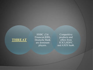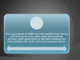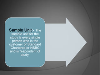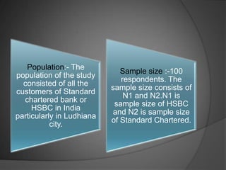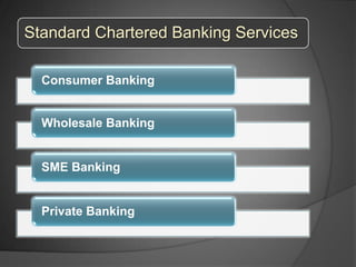 Standard Chartered Bank was founded in 1853 and is headquartered in London. It has over 1,700 branches worldwide including 90 in India and 3 in Punjab. The presentation discusses the six-week industrial training completed at Standard Chartered Bank, covering the bank's products and services in retail banking such as savings accounts, credit cards, insurance policies, and ATM usage. Customer surveys were conducted and data was analyzed regarding dealings with the bank, services used, problems faced, and levels of satisfaction. Suggestions are provided to improve retail banking services based on findings from the customer surveys and training experience.