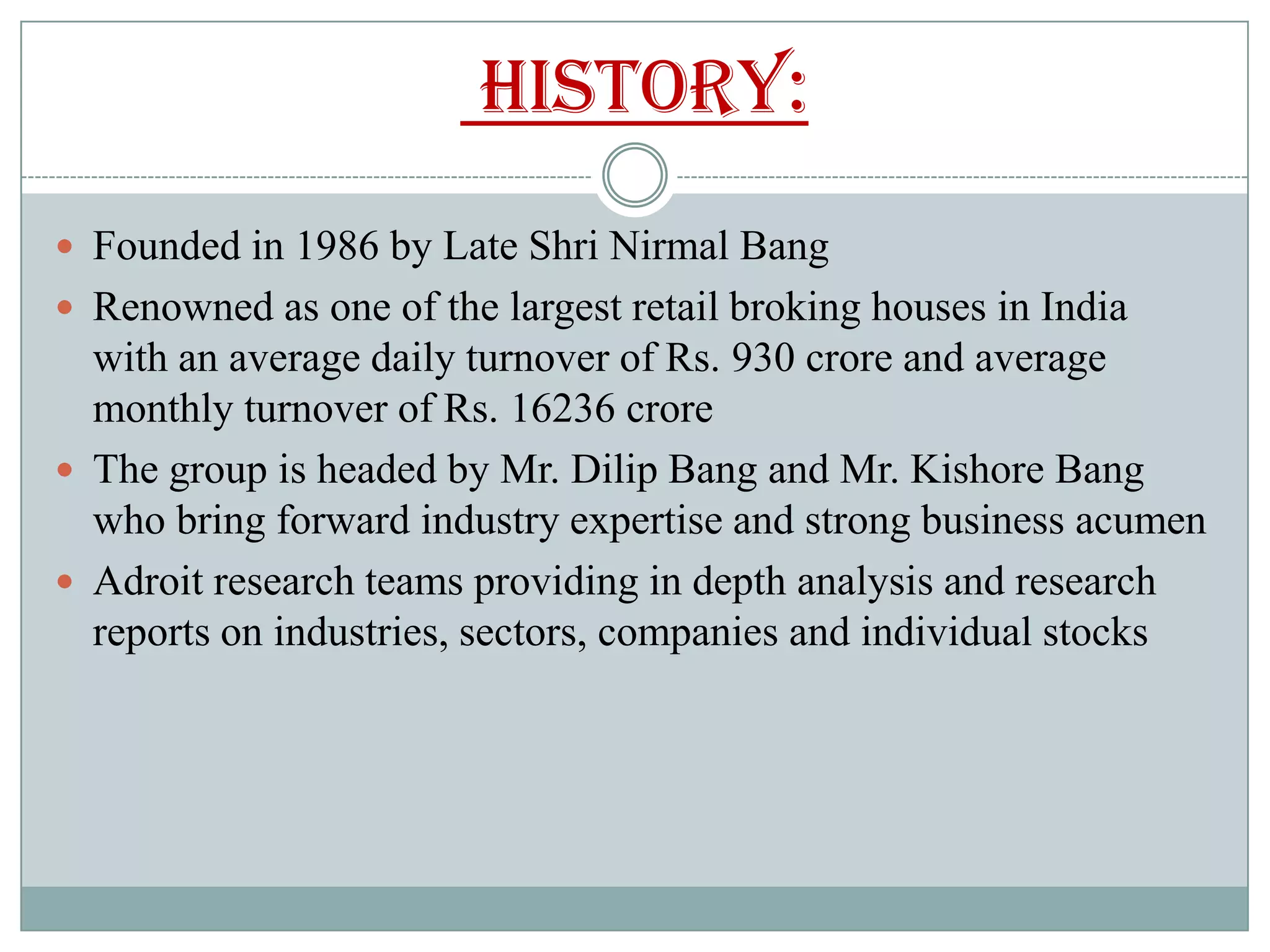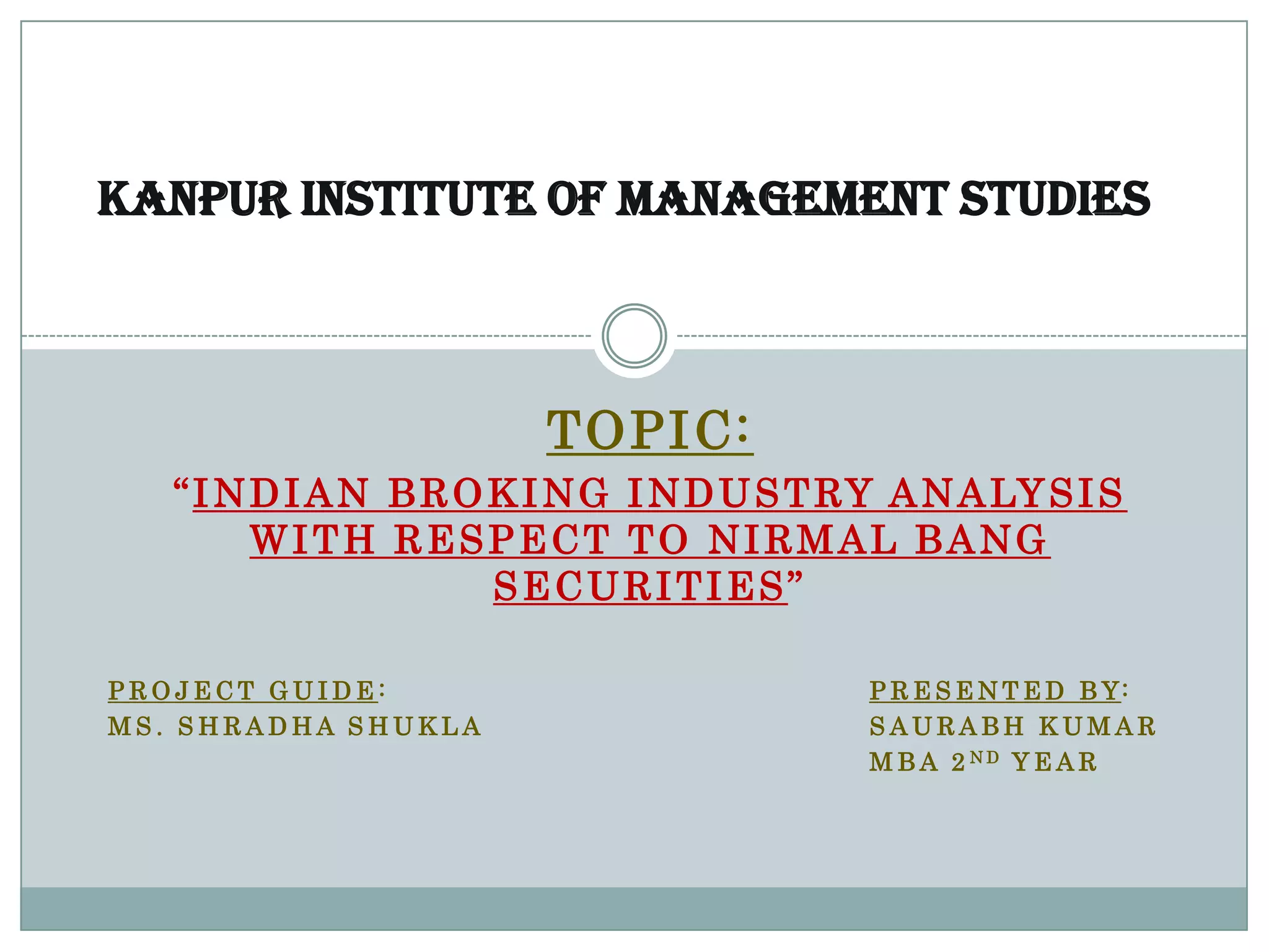 Nirmal Bang Securities is one of the largest retail broking houses in India. It was founded in 1986 and has over 450 branches and 8000 employees. It provides a range of financial services including stock broking, mutual funds, portfolio management, and insurance products. The company has over 28 lakh investors and an average daily turnover of Rs. 930 crore. It is a member of various exchanges like BSE, NSE, MCX, and NCDEX. The document discusses Nirmal Bang's history, products, services, competitors, and key personnel. It also outlines the objectives and research methodology of analyzing Nirmal Bang's online trading strategies.