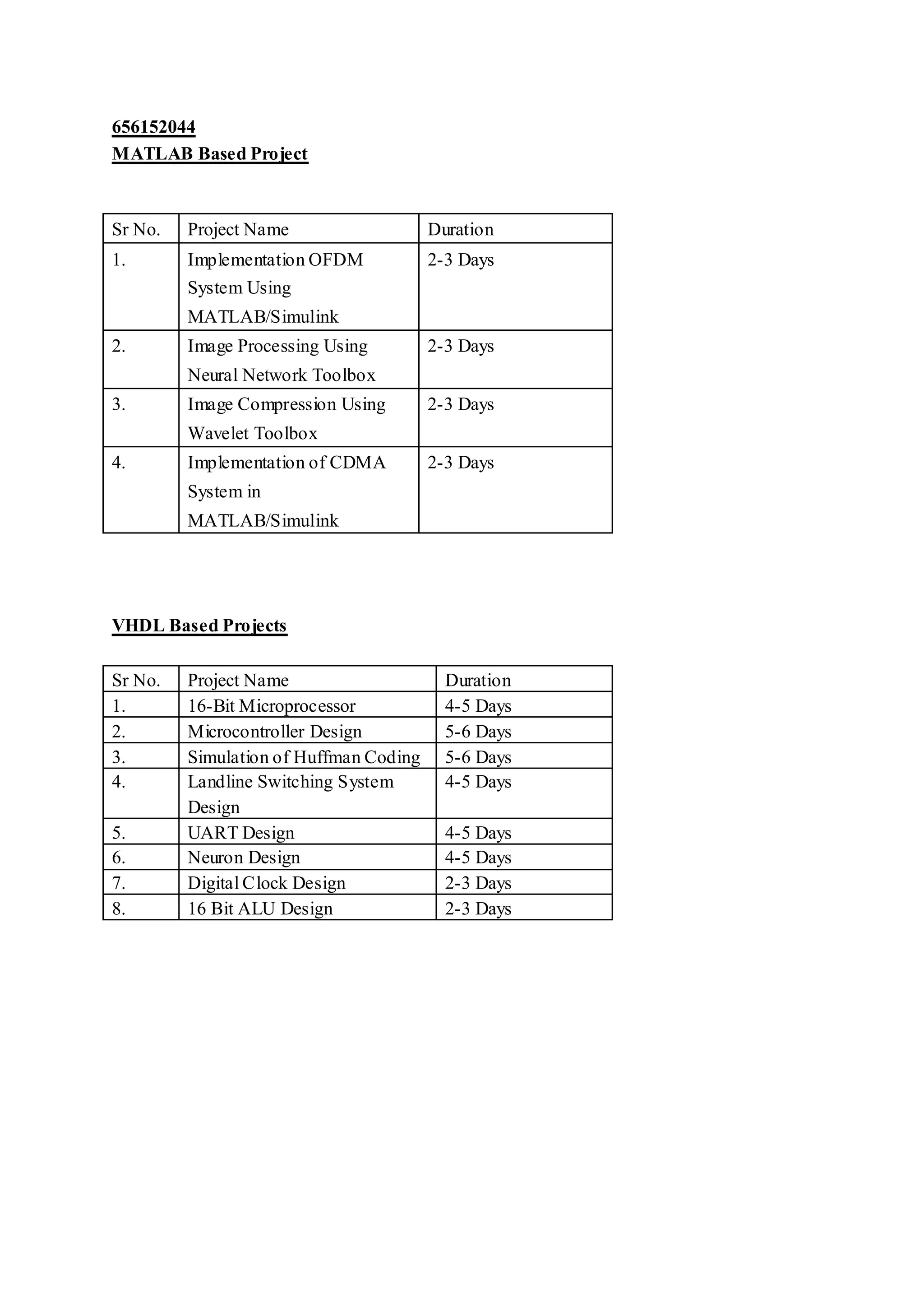 The document lists various projects categorized into MATLAB-based, VHDL-based, and embedded system projects, along with their respective durations. MATLAB projects include OFDM implementation, image processing, and CDMA systems, while VHDL projects range from microprocessor design to digital clock design. Embedded system projects cover applications like digital bus systems and automatic parking systems, each taking 2-6 days to complete.