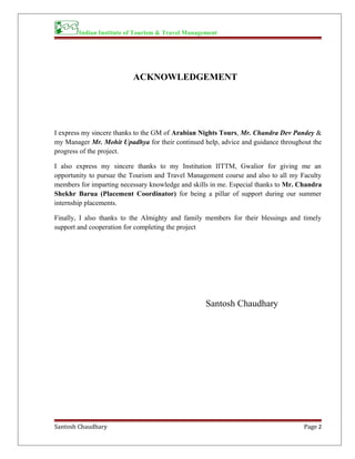 Santosh Chaudhary completed a two-month tourism industry study at Arabian Nights Tours LLC in Delhi. During the training, Santosh learned about the various departments of the tour operation company and the steps involved in selling a tour package. This included receiving customer inquiries, preparing quotes, booking hotels, documentation, and more. Through this experience, Santosh gained valuable exposure to the operations of a tour company and how they manage tour packages from start to finish.