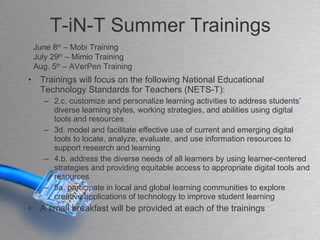 The document announces technology training sessions during the summer for teachers to learn how to use different educational software and tools. There will be three sessions in June, July, and August focusing on Mobi, Mimio, and AVerPen software respectively. Each session will provide an overview of the software's features and allow teachers to practice using the tools, record lessons, and access lesson resources to prepare for the upcoming school year. A small breakfast will be provided at each voluntary training held at Calallen East Primary's new computer lab.