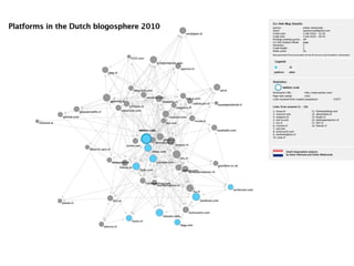 The document discusses how social media and Web 2.0 have changed the nature of links and networks online. In Web 1.0, hyperlinks mainly linked to static pages, but in Web 2.0 links can connect to dynamic content and social objects like likes, shares, and saves. This has expanded the types of associations that can form networks beyond just hyperlinks. Tracking these new link types and how platforms handle them could help develop an "IssueCrawler 2.0" to map issue networks in the current social media environment.