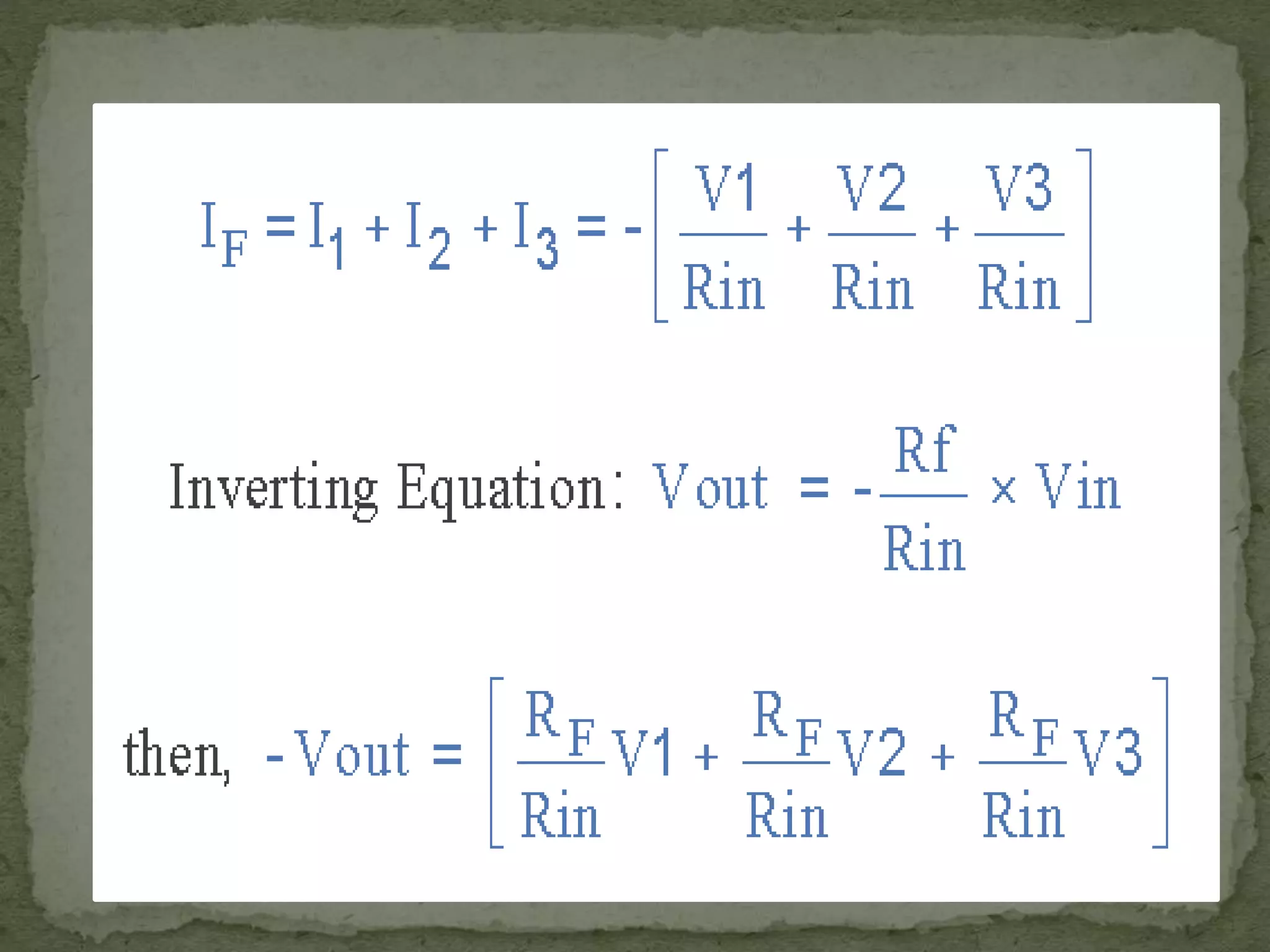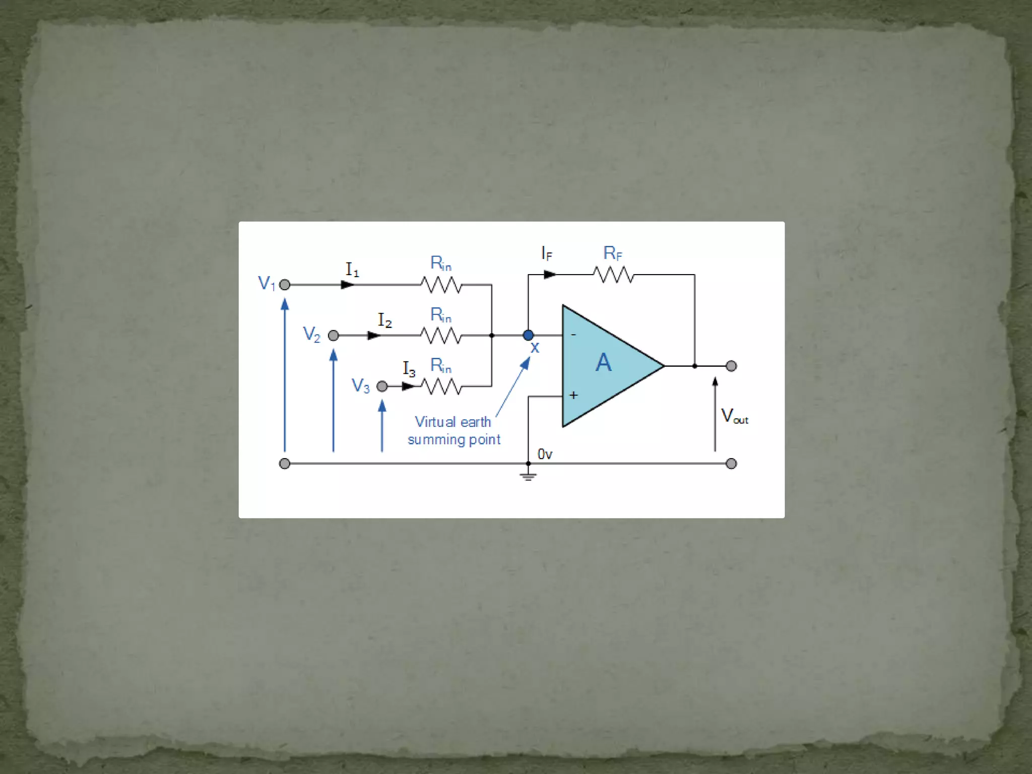 This document describes a summing amplifier circuit using an operational amplifier (op-amp). The summing amplifier allows multiple input signals to be added together at the output. It discusses an inverting summing amplifier configuration with three input voltages V1, V2 and V3. The circuit produces an output voltage proportional to the algebraic sum of the three input voltages, effectively adding them, because each input sees its own resistor and they are isolated by the op-amp's virtual earth. Scaling can also be achieved if the input resistors are unequal.