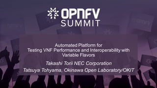 The document outlines the Okinawa Open Laboratory's (OOL) mission to promote advanced ICT technologies, notably software-defined networking (SDN) and cloud computing, in support of regional industrial development. It details the development of a VNF (Virtual Network Function) automation testing system to address the challenges of VNF testing, such as performance variability and lack of standardization. The document also highlights the collaborative efforts of various stakeholders to enhance VNF interoperability and test automation capabilities in the emerging market.