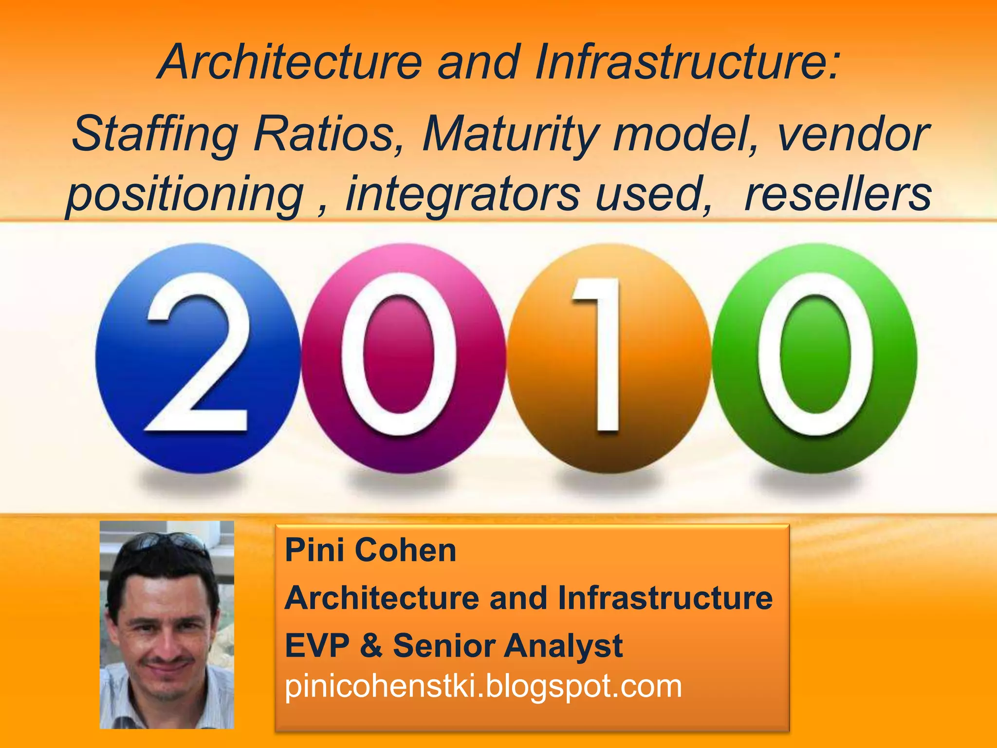 The document provides an overview of various metrics related to architecture and infrastructure, including staffing ratios, maturity models, vendor positioning, and support for enterprise systems management and databases. Key findings indicate significant discrepancies in support ratios across different system types, particularly for EAI/SOA, DBMS, and server management. The document also highlights market positioning for technology vendors and recommended integrators in the industry.