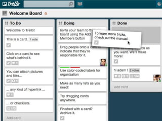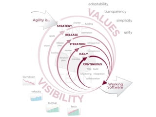 The document discusses the concept of agile marketing, highlighting the challenges and complexities in modern marketing driven by rapid technological advancements and changing consumer behavior. It advocates for using agile management principles to create adaptive, iterative marketing processes that prioritize collaboration, transparency, and responsiveness to feedback. The document also emphasizes the benefits of agile adoption, such as improved project visibility and increased productivity, while suggesting resources for implementing agile marketing strategies.