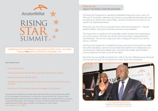The document summarizes an upcoming summit event called the ArcelorMittal Rising Star Summit that recognizes and connects young talented individuals in South Africa and Kenya. Over the past four years, the Rising Star Programme has recognized over 300 individuals. The September 28, 2016 summit in Johannesburg will gather the most talented young people across the country to discuss the future of business in South Africa. Sponsorship opportunities are available for companies to engage with the exclusive network of rising stars.