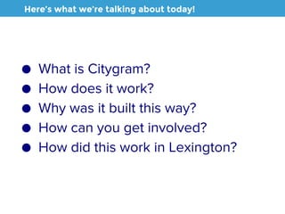 Citygram is a notification platform designed to improve citizen engagement by utilizing open data to provide timely and relevant information about city activities. It aims to proactively inform citizens, reduce the workload on city staff, and showcase the capabilities of open data portals. The document outlines its goals, guiding principles, integration processes, and offers a case study on its application in Lexington, KY.