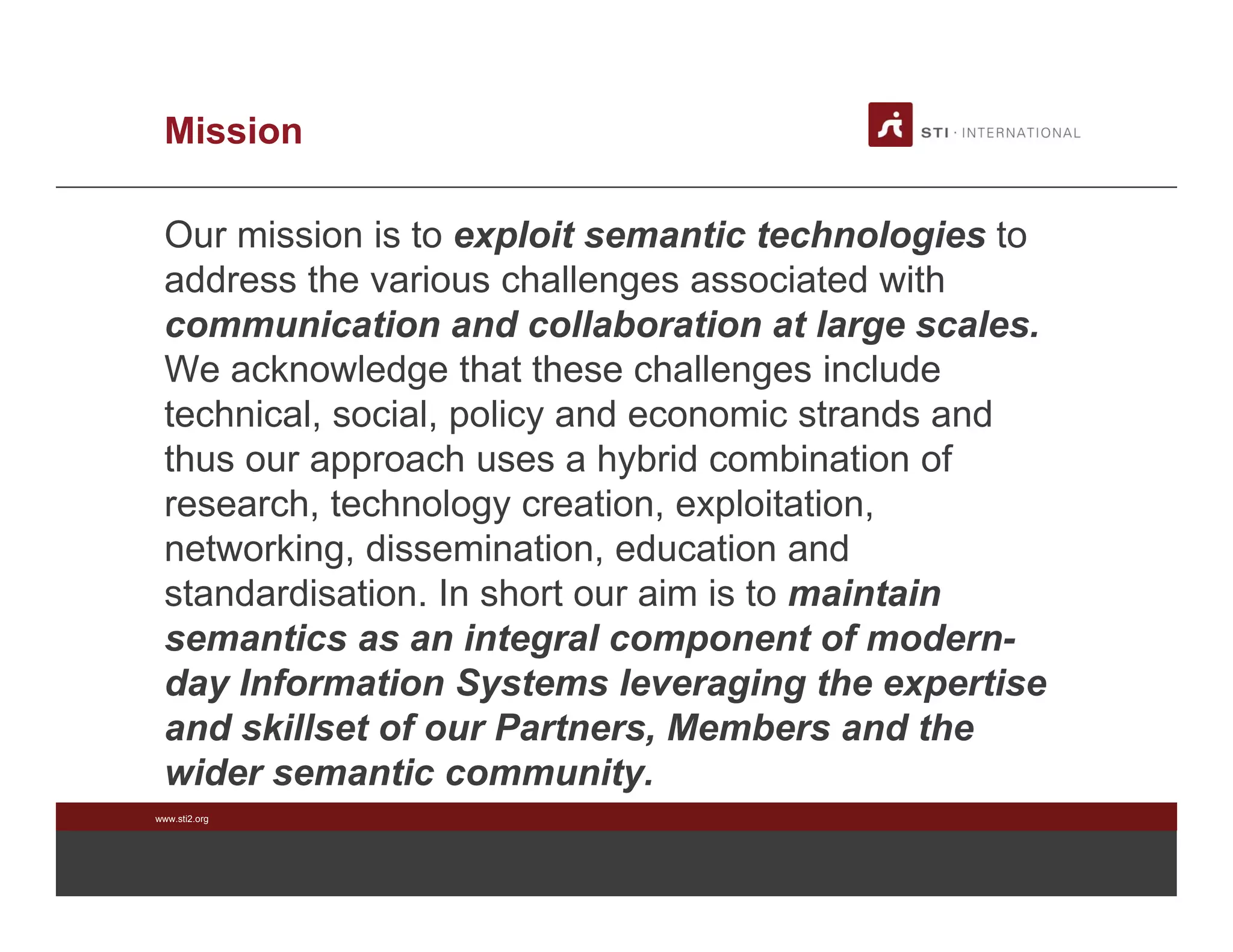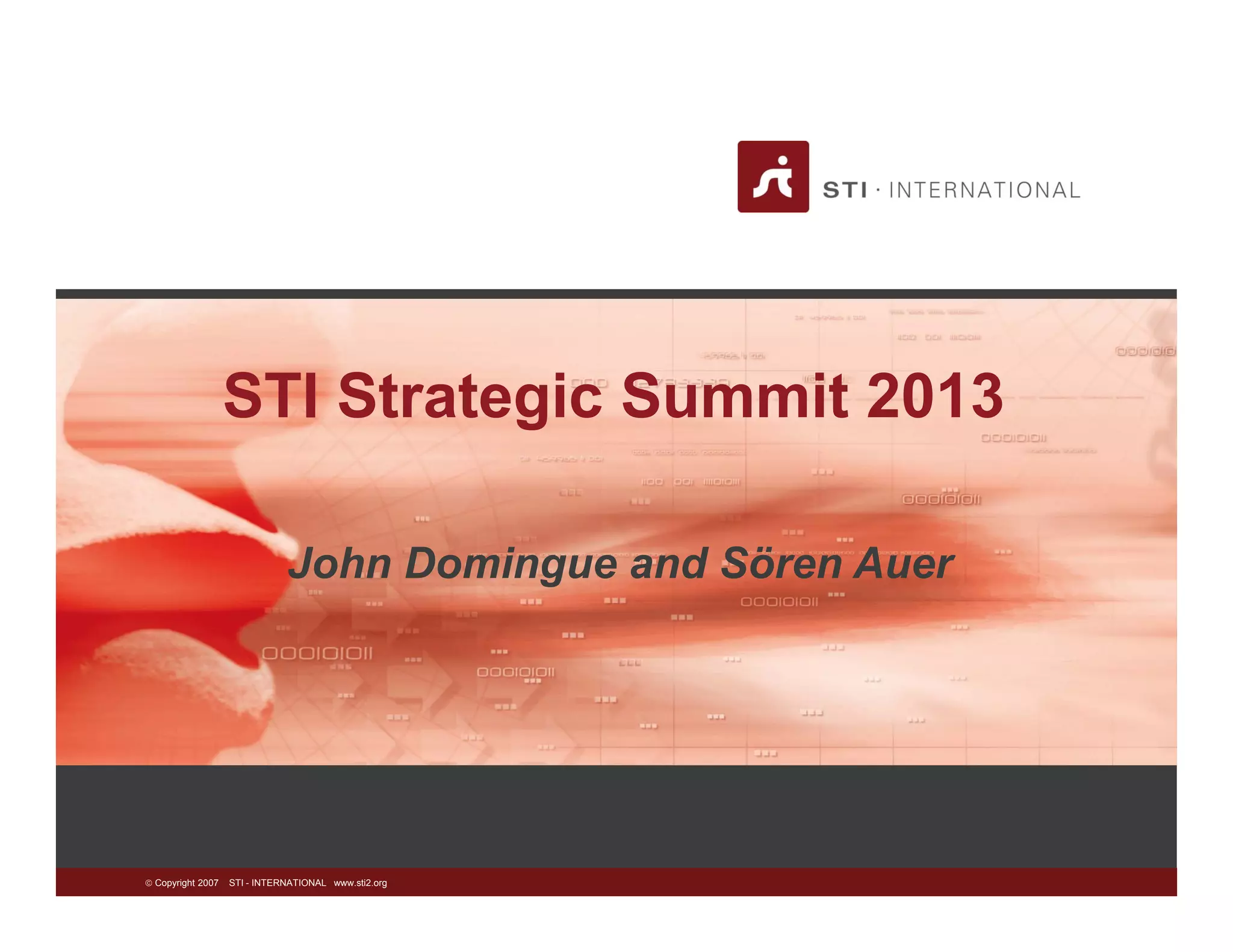 STI International is a non-profit organization that aims to address challenges of communication and collaboration at large scales through semantic technologies. It has 11 partner organizations, 15 members, and several fellows. STI holds biennial Semantic Summits to discuss strategic issues and directions for semantic technology. The 2013 summit agenda shows sessions on topics like the semantic web in Russia, data science curriculum, and future funding for semantics in Europe.