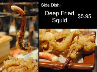 Sumo Ramen is a Japanese noodle house located in Montreal's China Town that serves ramen noodles, rice dishes, appetizers like fried squid and squid balls, drinks like bubble tea, and has a cozy atmosphere with chopstick boxes and relaxed lighting at every table. Main dishes include miso or soy ramen for $9.95-$10.95 and curry rice served with beef, shrimp, or chicken for $9.45.