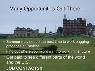This document provides information about summer internship and study abroad opportunities for agronomy students. It describes internship opportunities at golf clubs and courses in locations like Washington D.C., Tennessee, Scotland, and Florida. It also shares details about a study abroad program at the University of Aberwystwyth in Wales. Tips are provided for pursuing these opportunities, such as talking to Professor Cale to get guidance and getting resumes out early. Several students share their experiences from past internships.