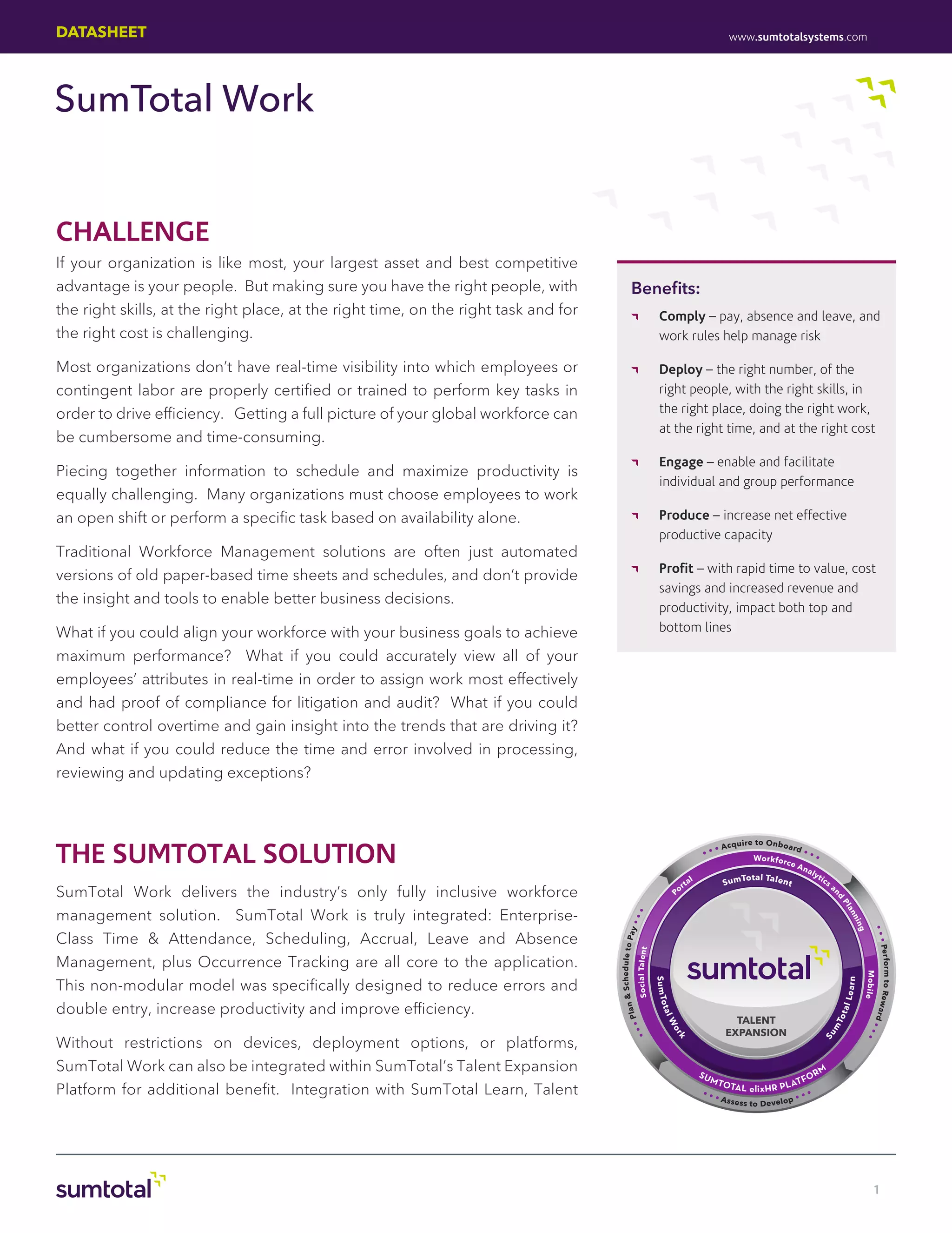The document discusses the challenges that organizations face in managing their workforce effectively. It is difficult to ensure the right employees have the right skills and are assigned to the right tasks. Traditional workforce management solutions do not provide insights needed to make better business decisions. The SumTotal solution aims to address these challenges by providing a fully integrated workforce management platform that includes time and attendance tracking, scheduling, leave and absence management, and other core functionality. This is designed to improve efficiency, reduce errors, and better align the workforce with business goals.