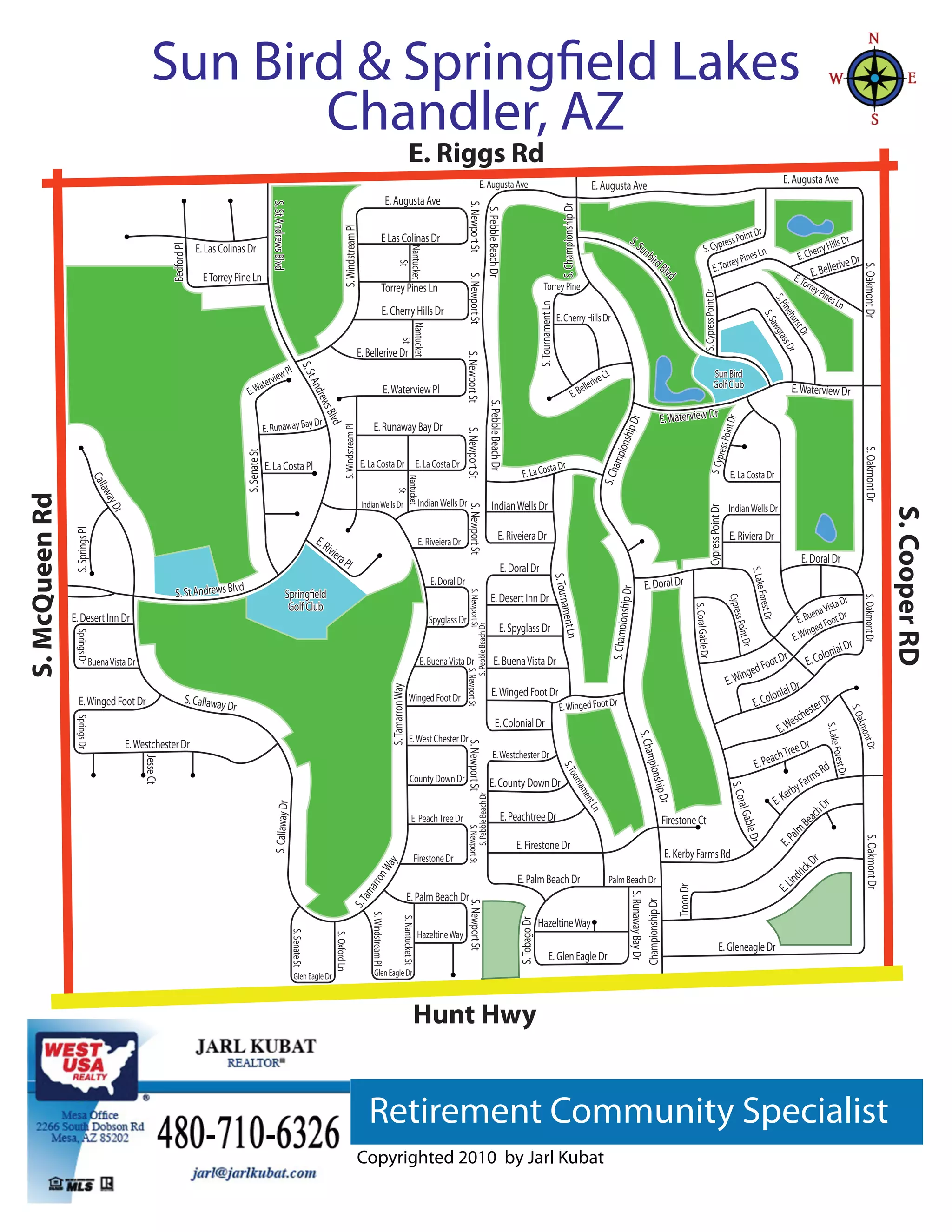 This document provides an overview map of the Sun Bird & Springfield Lakes communities located in Chandler, Arizona. The map outlines the street names and layout of the two communities, which are located near each other. It also labels some of the amenities within the communities, such as golf clubs and lakes.